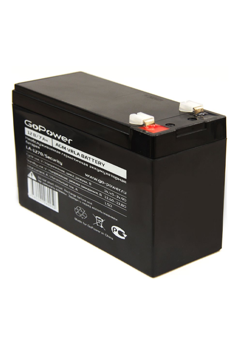 Аккумулятор свинцово-кислотный GoPower LA-1270 12V 7Ah. Свинцово-кислотные аккумуляторные батареи GoPower LA-1270 12V 7Ah полностью герметизированные, необслуживаемые, с системой рекомбинации газов (VRLA). Аккумулятор GoPower производится по технологии AGM электролит абсорбирован в стекловолоконном сепараторе, что обеспечивает абсолютную защищенность от утечки электролита. Материал корпуса и крышки сделан из огнеупорного высококачественного ABS пластика. Аккумуляторные батареи GoPower отличаются широким диапазоном рабочих температур от - 20 С до +50 С и минимальным саморазрядом не более 2,5 % в месяц при нормальных условиях. Аккумуляторы соответствуют международным стандартам безопасности и рекомендованы для применения в охранно-пожарных системах, системах контроля и управления доступом, источниках бесперебойного питания (ИБП), телекоммуникационном оборудовании, осветительном оборудовании, детских электромашинах и других областях.