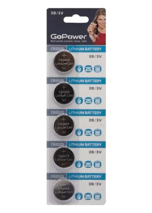 Батарейка GoPower CR2025 BL5 Lithium 3V (5/100/2000) 00-00015604 широко используется в пультах автомобильной сигнализации, часах, кухонных весах, часах и других устройствах бытового и промышленного назначения.