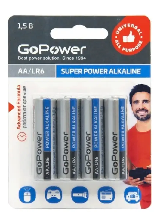 Батарейка GoPower LR6 AA BL4 Alkaline 1.5V 00-00015601 универсального назначения, она идеально подходит для большинства современных устройств. Благодаря улучшенной формуле этот элемент питания работает дольше.