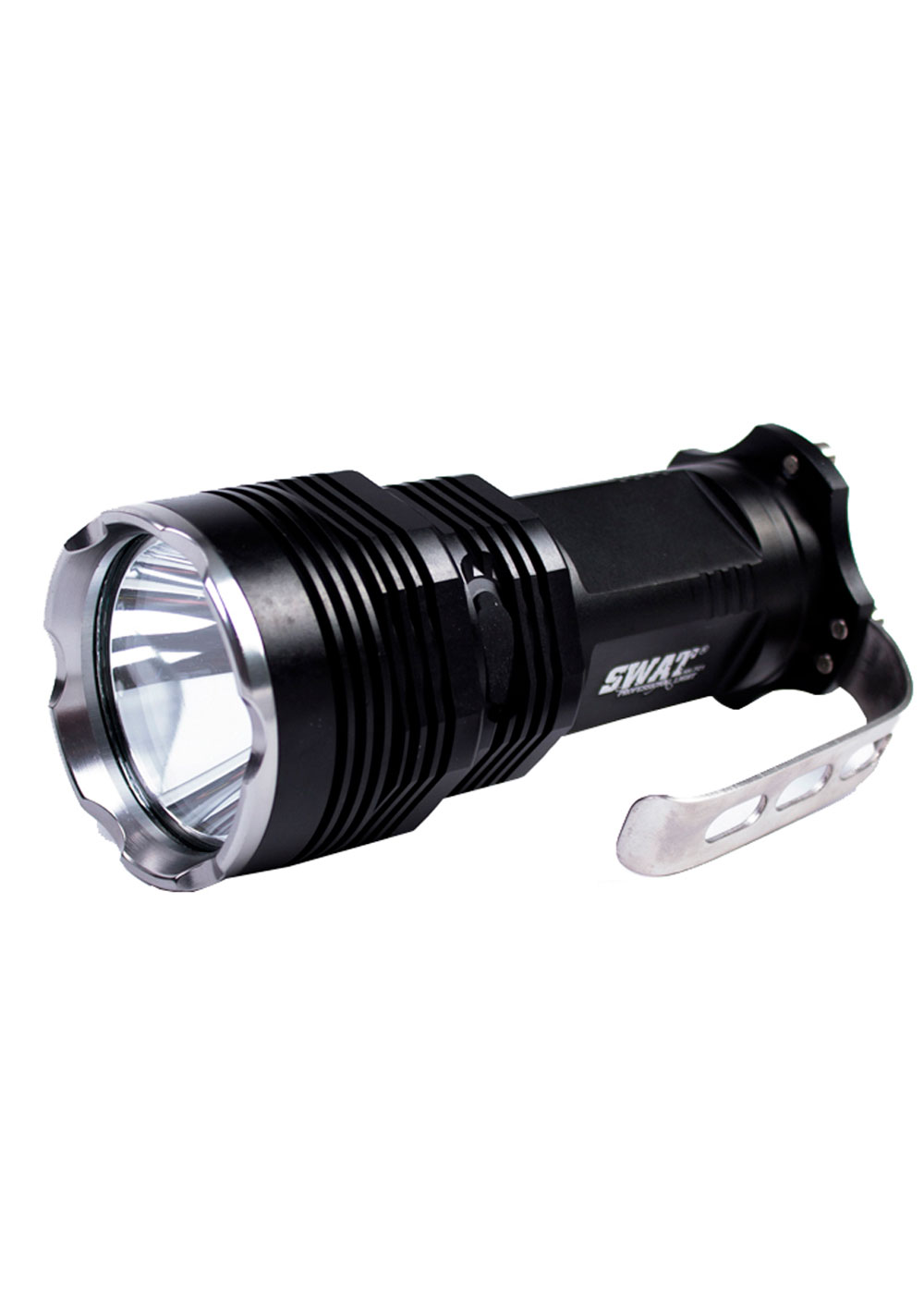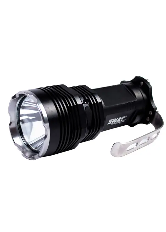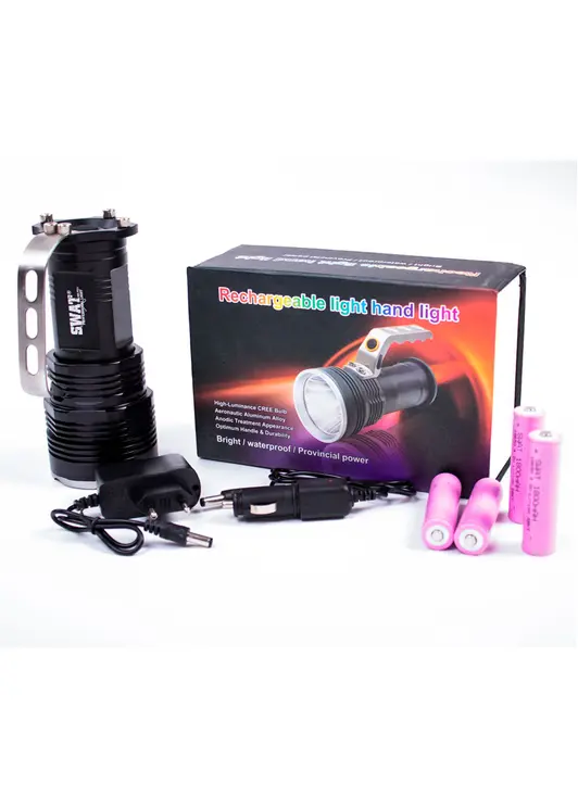 Светодиод CREE XM-L T6 встроенный в ручной фонарь SWAT NK-TC1 T6 обладает световым потоком в 800 люмен. Такой мощностью можно осветить участок дороги до 500 метров. Питание прожектора осуществляется 4-мя аккумуляторами 18650 с емкостью 1800 mAh. Предусмотрена зарядка от и от стандартной сети 220В и от автомобильного прикуривателя. Для различных нужд подсветки, разработчики сделали 4 режима подсветки и SOS. Светодиодный фонарь SWAT NK-TC1 в черном цвете, сделан из авиационного анодированного алюминия, имеет защиту от попадания влаги и грязи. Для удобства ношения предусмотрена ручка-держатель, при необходимости ее можно использовать для подвешивания фонаря. Несмотря на габариты в 162*70 мм, вес прожектора 413 гр. Такой фонарь подойдет сотрудникам охранных предприятий, работникам коммунальных служб.
