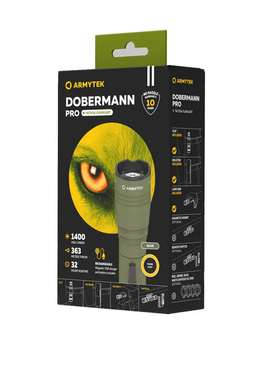 Dobermann Pro — это модель с узким углом света и плавным переходом между центральным пятном и боковой засветкой. Сочетание компактного корпуса и впечатляющих характеристик светового потока делает Dobermann Pro фонарем 2 в 1 для тактического использования и на каждый день.
