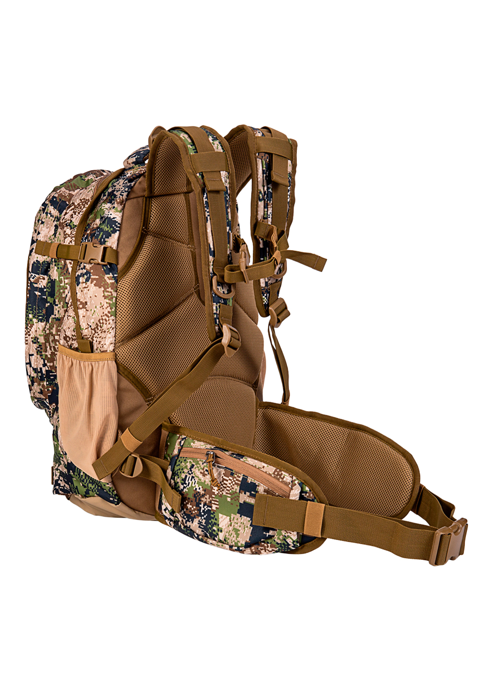 Отличный рюкзак для охотничьего снаряжения с возможностью зафиксировать ружье или арбалет. Имеет специальный модуль для фиксации приклада и ремни для фиксации ствола охотничьего оружия. Эргономика рюкзака при относительно небольшом размере позволяет компактно упаковывать и распределять вещи. . Есть регулировка по длине, дополнительные лямки усиления в нижней и верхней части для комфортной эксплуатации и распределения нагрузки. Два внутренних отделения (большое и малое). В малом отделение установлен карабин для фиксации ключей, 3 кармана на стяжках и дополнительные ячейки на резинках (для фонаря, манков и т.д.) В малом отделение присутствует крепление и регулировка наружной ткани. Когда рюкзак подвешен можно использовать малый отсек как столик. Снизу рюкзака в отдельном кармане установлен модуль для нижней опоры ружья. При длительной переноске ружье можно установить на рюкзак (нижняя опора и 3 стяжки крепления).