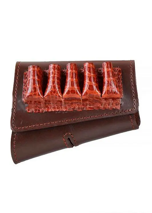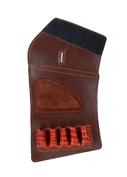 Патронташ на прикладе из натуральной кожи коричневого цвета предназначен для хранения и быстрого доступа к патронам различного калибра. Прочный, надежный и удобный в использовании, он идеально подходит для охотников и стрелков.