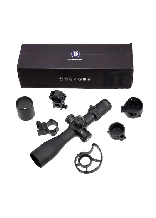 Также рядом присутствует поворотный элемент, отвечающий за выставление диоптрий. Благодаря этому прицел Дискавери HT применим без корректирующих очков, если стрелок имеет проблемы со зрением - настройка делает изображение более резким, или размытым.