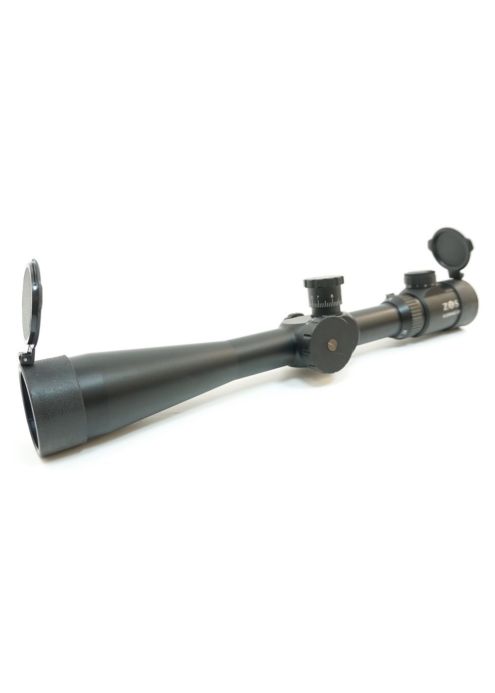 Корпус прицела ZOS 6-24x44 E-SF R10 произведен из алюминия. Он стоек к ударам, влажности, грязи. Весит 490 гр. Дизайн прибора эргономичен, а потому он очень удобен при пользовании.