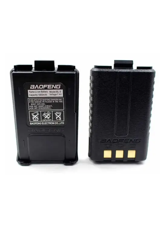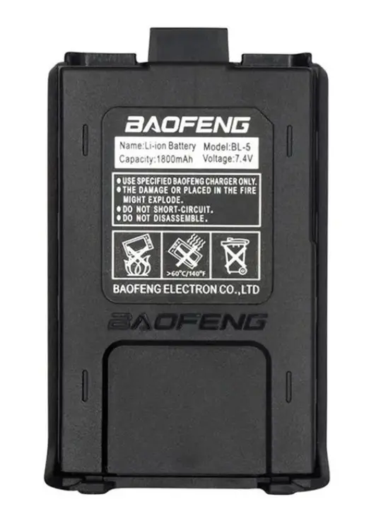 Литий-ионный аккумулятор для рации Baofeng UV-5R – идеально совместим с данной портативной радиостанцией. Будет работать точно так же, как «штатный» аккумулятор, который идет в комплекте, помогая вести продолжительные переговоры на расстоянии до 7-10 км в диапазонах 136-174/400 - 480 МГц. Емкость батареи 1800 mAh. Одного заряда АКБ хватает до 12 часов работы в автономном режиме: например, во время охоты или рыбалки. Точное время зависит от интенсивности переговоров. Главные преимущества литий‑ионного аккумулятора: быстрое время зарядки, легкий вес, долгий срок службы, низкая саморазрядка и отсутствие «эффекта памяти». Корпус выполнен в стандартном для профессиональных раций Баофенг черном цвете из прочного пластика. Устройство может эксплуатироваться в экстремальных условиях, срок службы 2 года. Также рекомендуем приобрести дополнительные аксессуары для радиостанции Baofeng UV-5R: USB-кабель, антенну, зарядное устройство, гарнитуру.