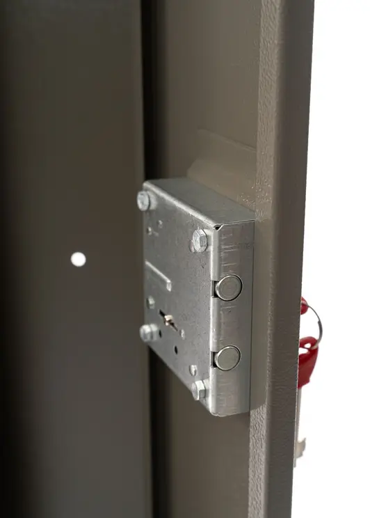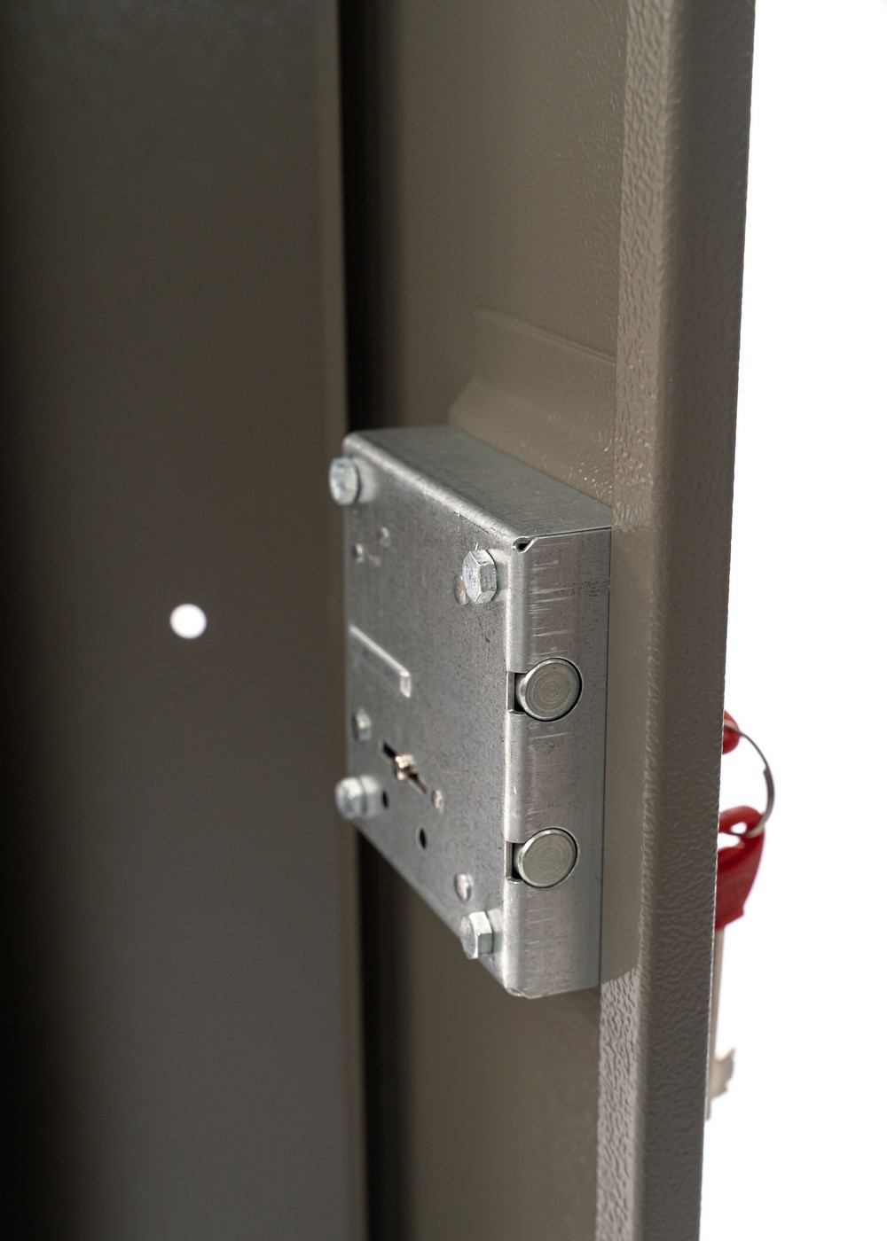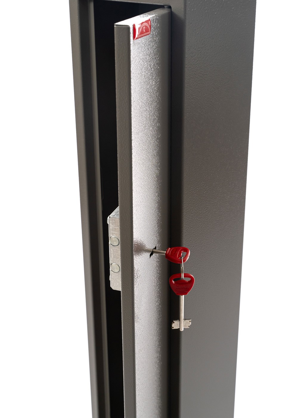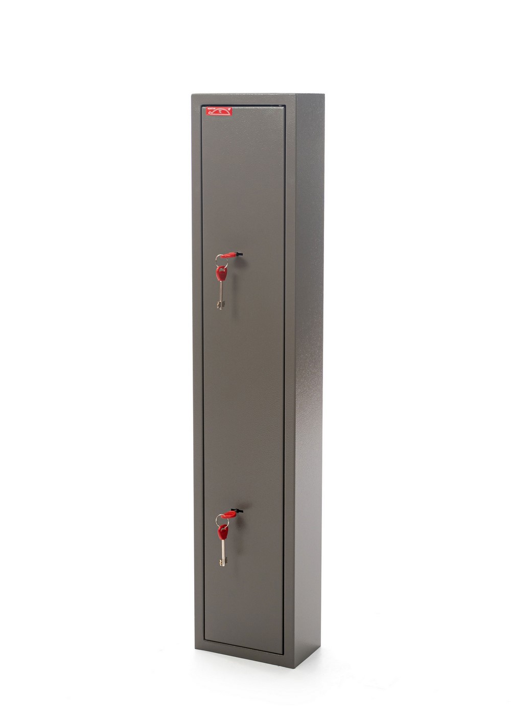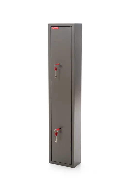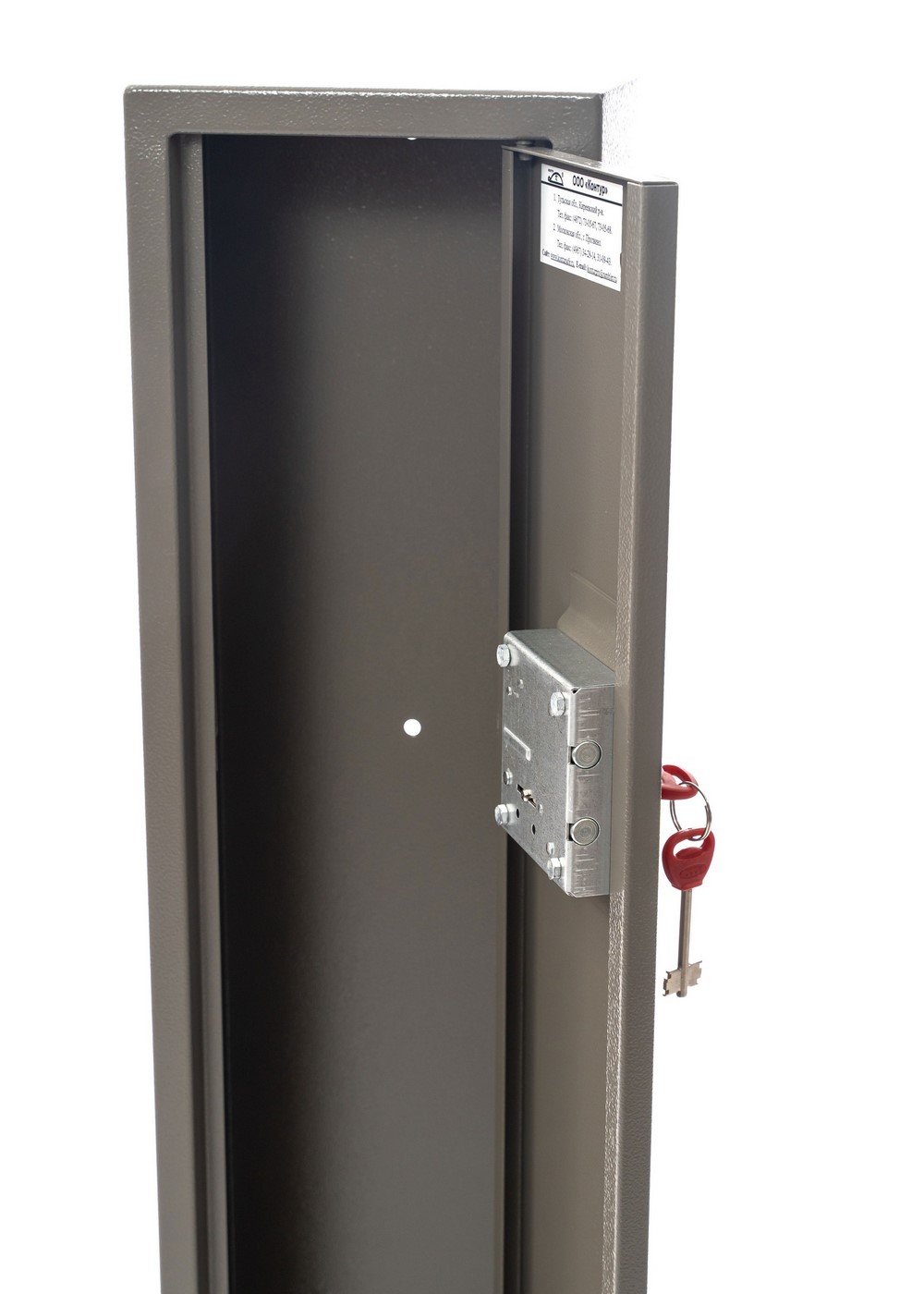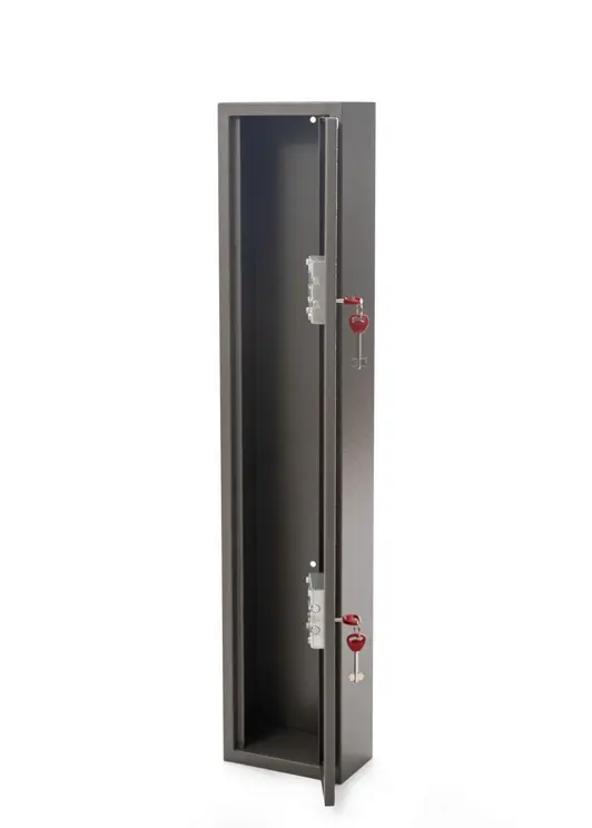 Шкаф Д-3 — это оружейный шкаф, предназначенный для хранения двух стволов длиной до 98 см. Он имеет высоту 100 см, ширину 20 см и глубину 12 см. Дверцы запираются на два шестисувальдных замка «Просам». Цвет шкафа серый.Характеристики: