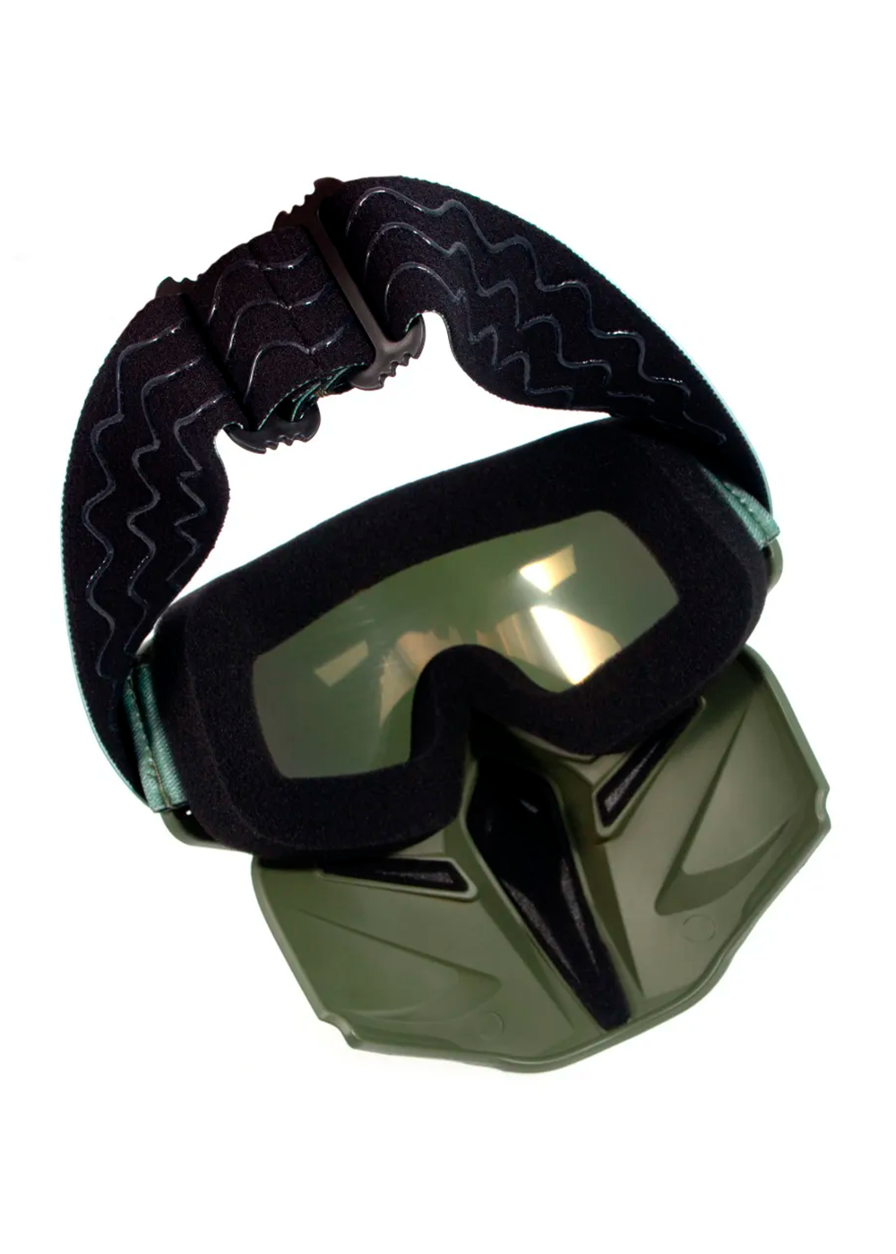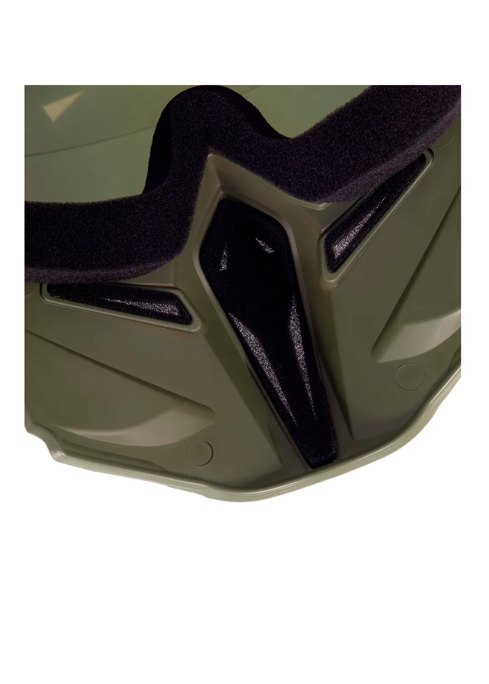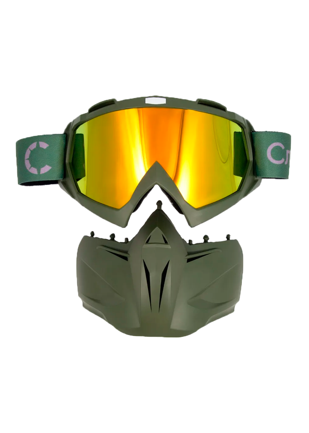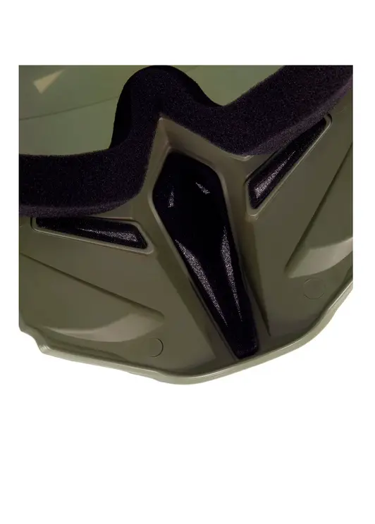 Маска состоит из двух частей, которые можно использовать как вместе, так и снять нижнюю часть и использовать только очки. В нижней части маски сделаны стильные воздухозаборники, а внутри вырезов размещена мелкая сетка для защиты органов дыхания от попадания инородных предметов при движении на скорости. Верхняя часть маски с внутренней стороны оснащена мягкой поролоновой накладкой для плотной и комфортной посадки на лице. А сверху маска вентилируется через систему отверстий, защищенных фильтром.