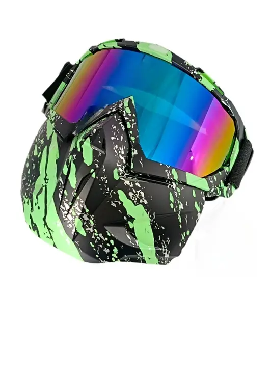 Маска-очки с радужной окраской линз и зелено-черной оправой - это универсальное защитное снаряжение, которое обеспечивает отличную видимость в различных условиях освещения. Благодаря особой конструкции линз и контрастной оправе, достигается улучшенная контрастность и защита от бликов, что особенно важно при активном движении на снегоходе или квадроцикле.