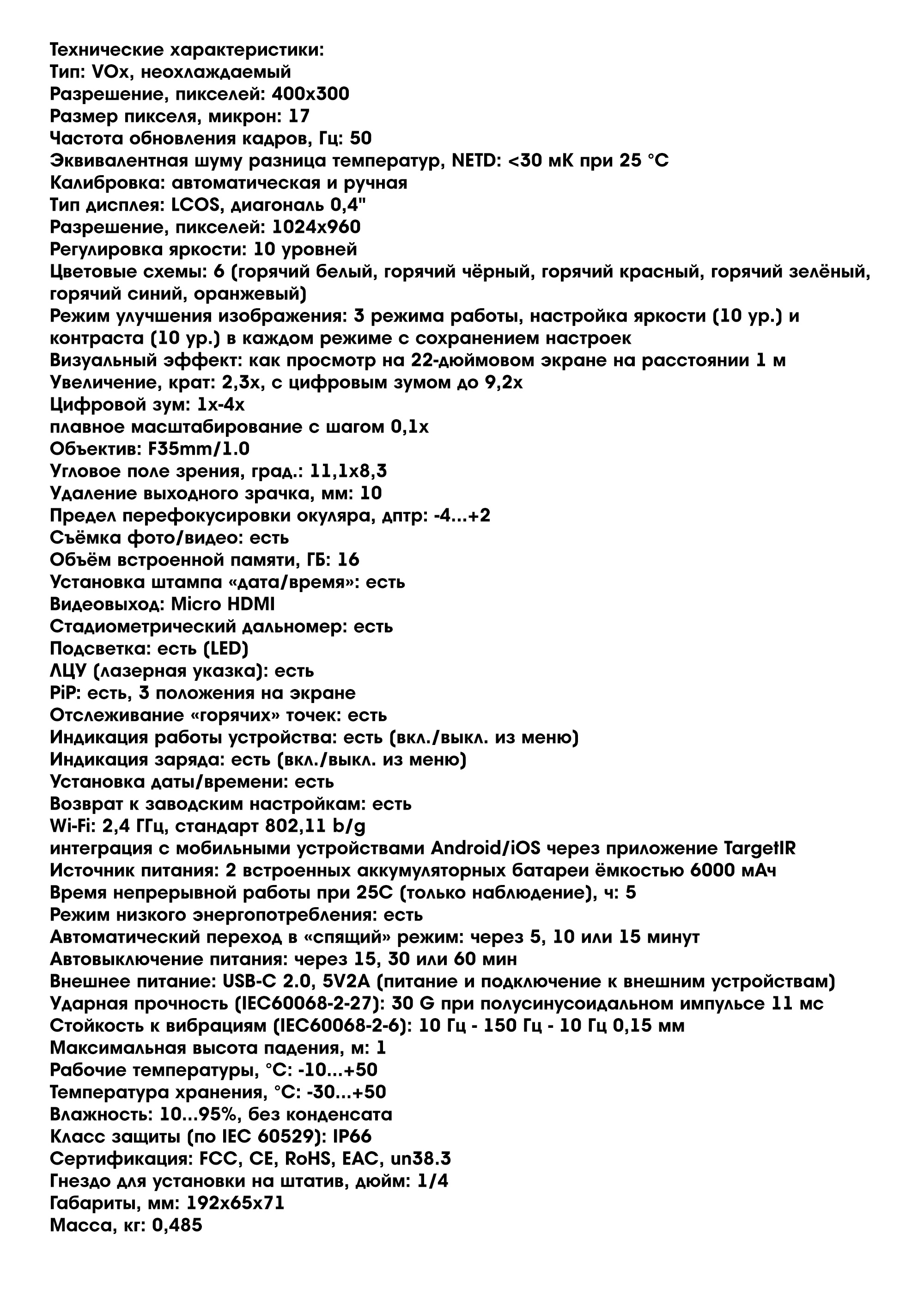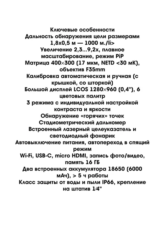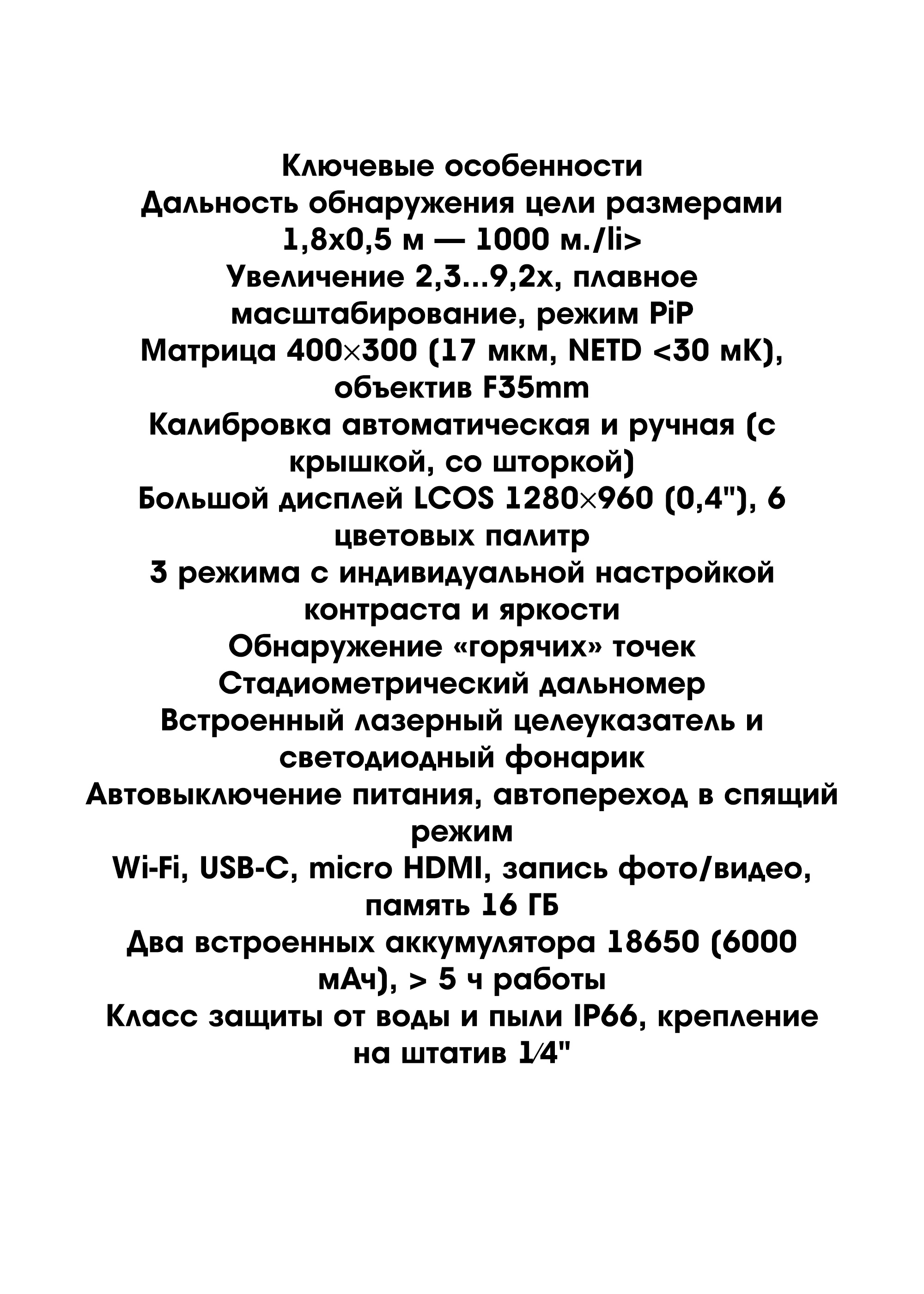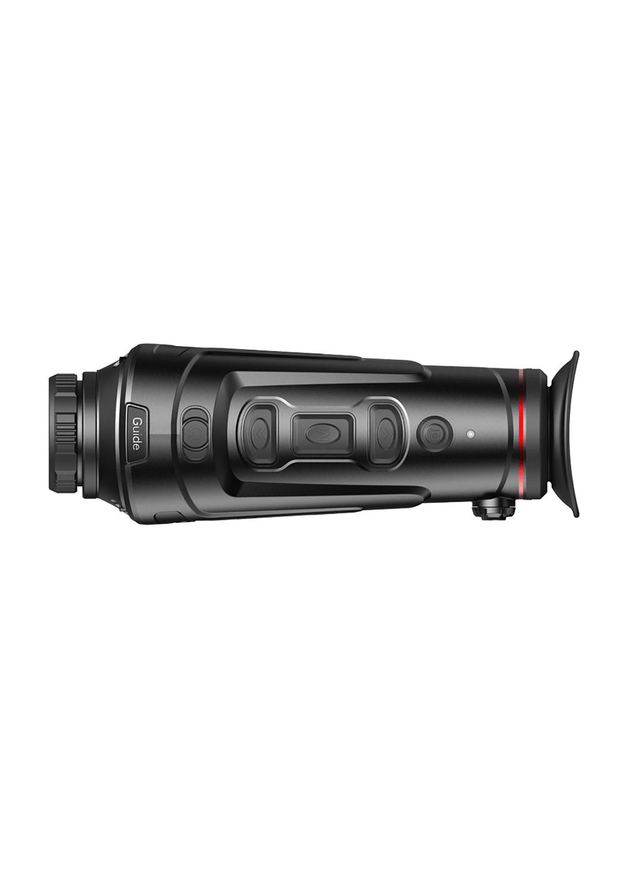 Тепловизионный монокуляр Guide TK431 — это устройство, предназначенное для использования в различных погодных и походных условиях. Оно оснащено матрицей собственной разработки Guide 400×300 (17 мкм, 50 Гц) и многолинзовым германиевым объективом с фокусным расстоянием 35 мм. Это обеспечивает увеличение 2,3–9,2x и плавное масштабирование, а также режим PiP. Дальность обнаружения человека составляет 1000 метров. Прибор имеет большой дисплей LCOS 1280×960 с разрешением 0,4 дюйма и 6 цветовыми палитрами. Также есть три режима настройки контраста и яркости, функция Hot Track для отслеживания самых горячих объектов и встроенный лазерный целеуказатель. Тепловизор работает на двух встроенных аккумуляторах 18650 ёмкостью 6000 мАч, обеспечивающих до 5 часов автономной работы. Устройство защищено от воды и пыли по стандарту IP66 и может использоваться со штативом 1⁄4".