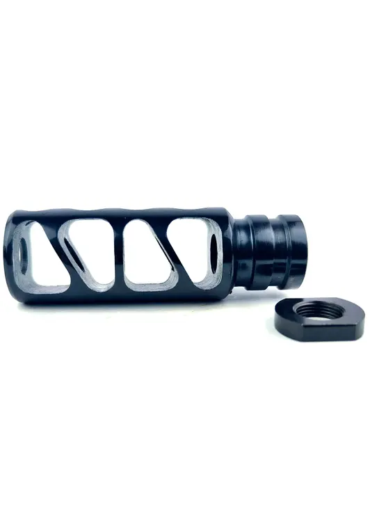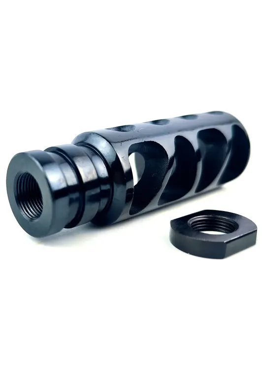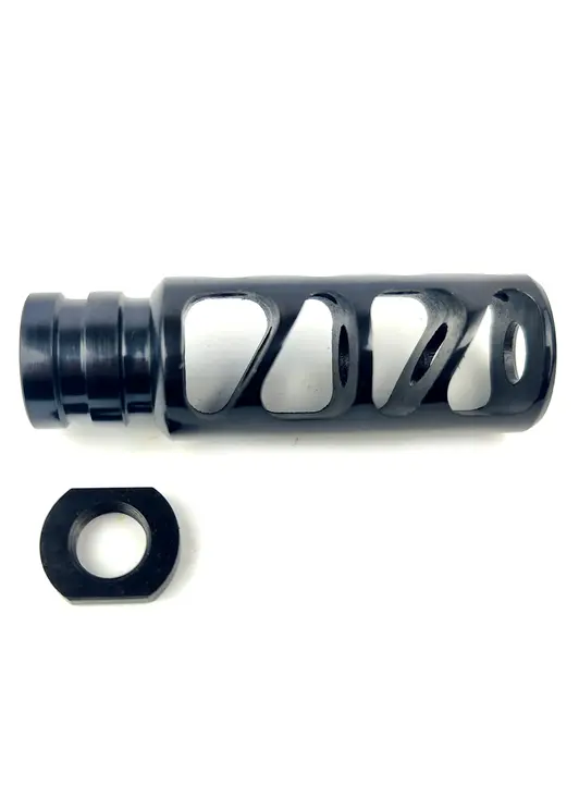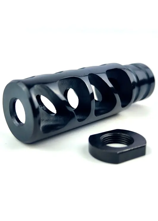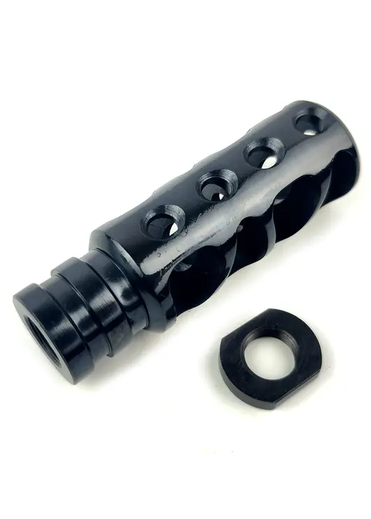 Пламегаситель Кордон AR-15 (.308Win) (20063). Четыре камеры, расположенные под определенными углами, направляют кинетическую энергию пороховых газов работать на уменьшение энергии отдачи. Замеры на станке показывают уменьшение толчка назад на 40-50 % и практически полностью гасится увод вверх и вправо.