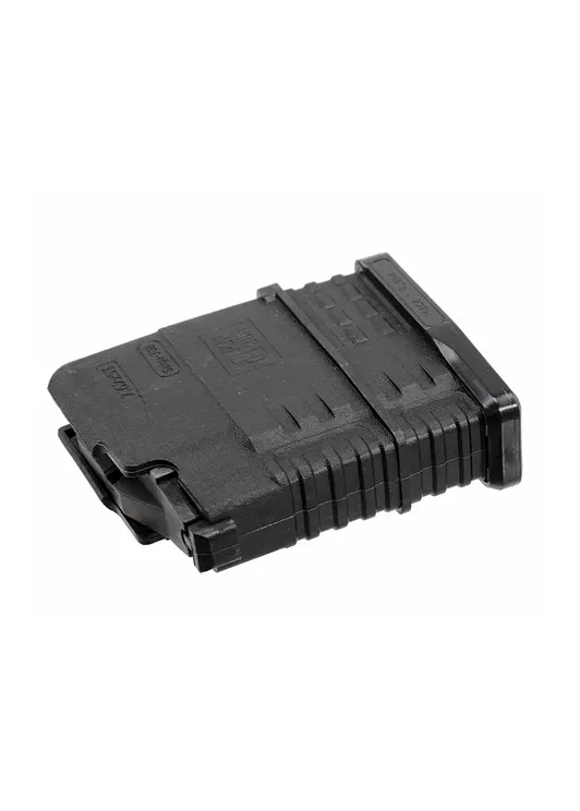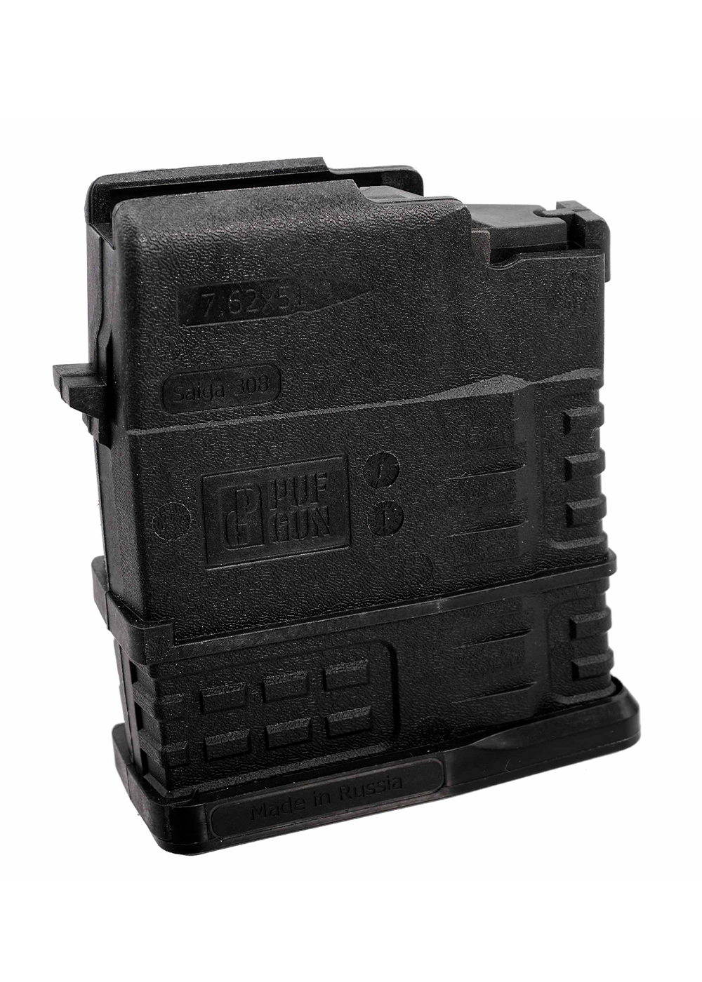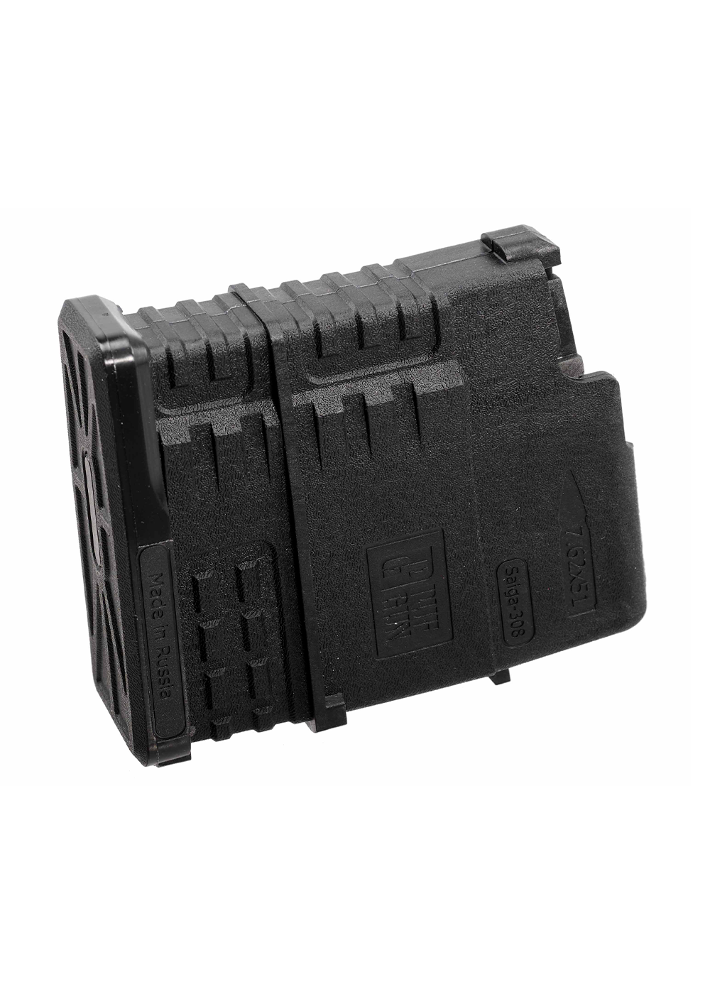 В число новых товаров бренда входит обозреваемый сменный десятиместный магазин под патроны калибра 7.62х51 миллиметров. Предназначено представленное изделие для гражданских охотничьих карабинов с нарезным стволом линейки Сайга-308. Подача боеприпаса происходит при помощи штатной пружины, для извлечения которой требуется утопить фиксирующую клавишу в основании пластиковой «пятки».