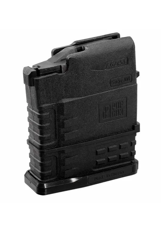 Пафган магазин Сайга Mag Sg308 изготавливается из полиамида, который выделяется повышенной прочностью, формирующий требуемую устойчивость конструкции к ударным нагрузкам, например, при падении приспособления на землю. Отмечается также функция уменьшения вместимости изделия до пяти патронов, посредством спила каркаса под соответствующей направляющей, на которой после изменения конструкции магазина фиксируется штатная «пятка».