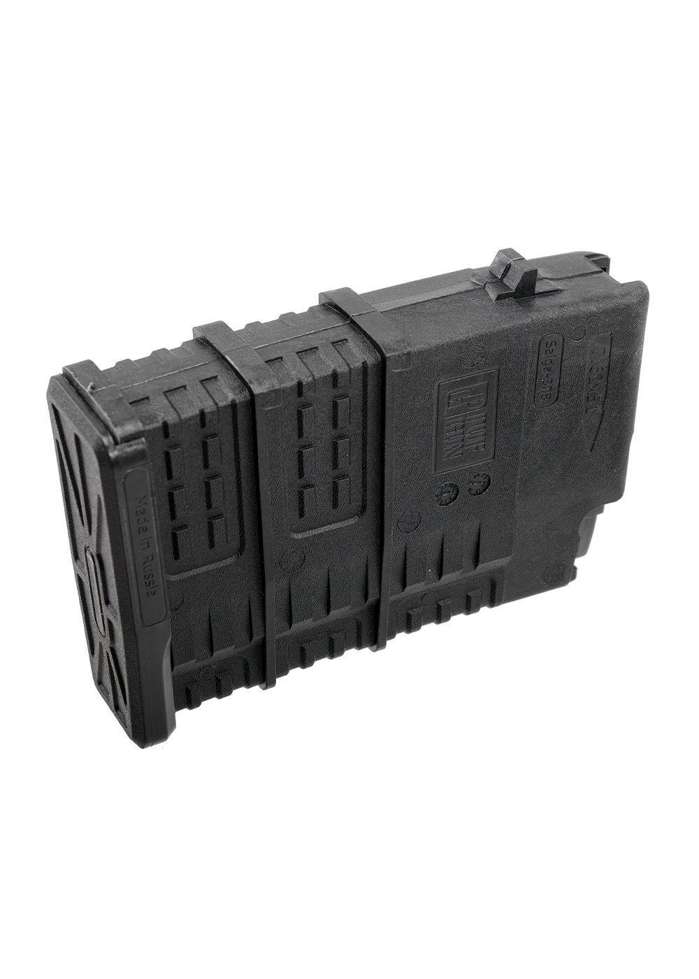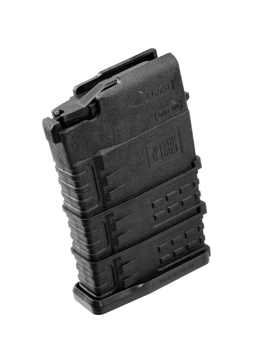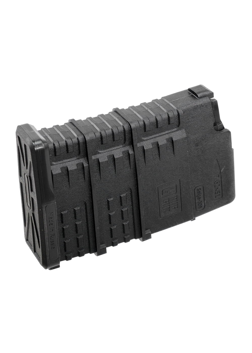 К описанной категории товаров относится обозреваемый магазин для карабинов модельного ряда Сайга-308 в калибре 7.62x51 миллиметров. Вместимость рассматриваемого элемента боепитания рассчитана на установку 15 патронов, подача которых происходит за счет металлической пружины.