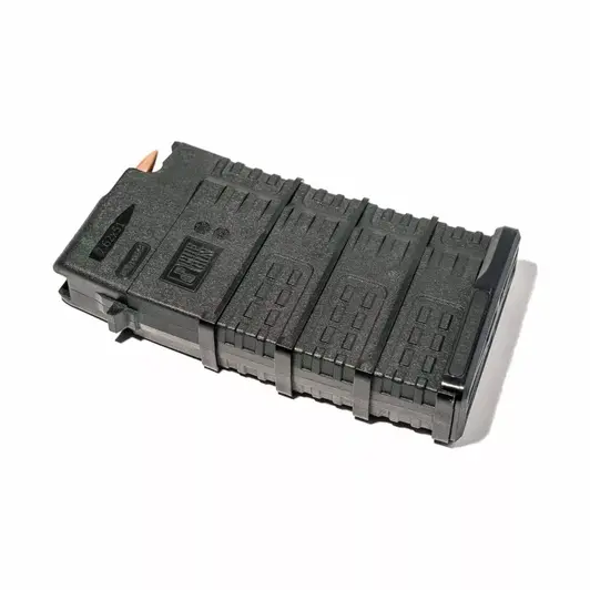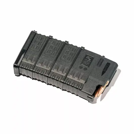 Магазин для карабина Сайга-308 имеет эргономичный дизайн и структурную поверхность корпуса, благодаря чему он не скользит в руках, облегчается перезарядка при любой погоде. Магазин вмещает 20 патронов. Чтобы почистить магазин следует утопить внутрь фиксатор тыльной крышки и снять ее, получив доступ для обслуживания (осторожно – внутри расположена пружина под давлением). Уменьшить емкость магазина до необходимого размера можно вручную, используя выступ, предназначенный для установки тыльной крышки. Он изготовлен из легкого и прочного композита, обладает повышенной прочностью, стойкий к ударным нагрузкам.