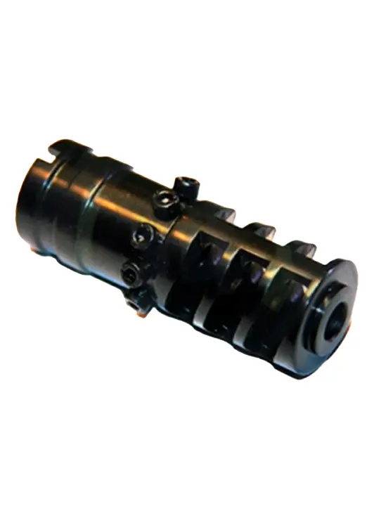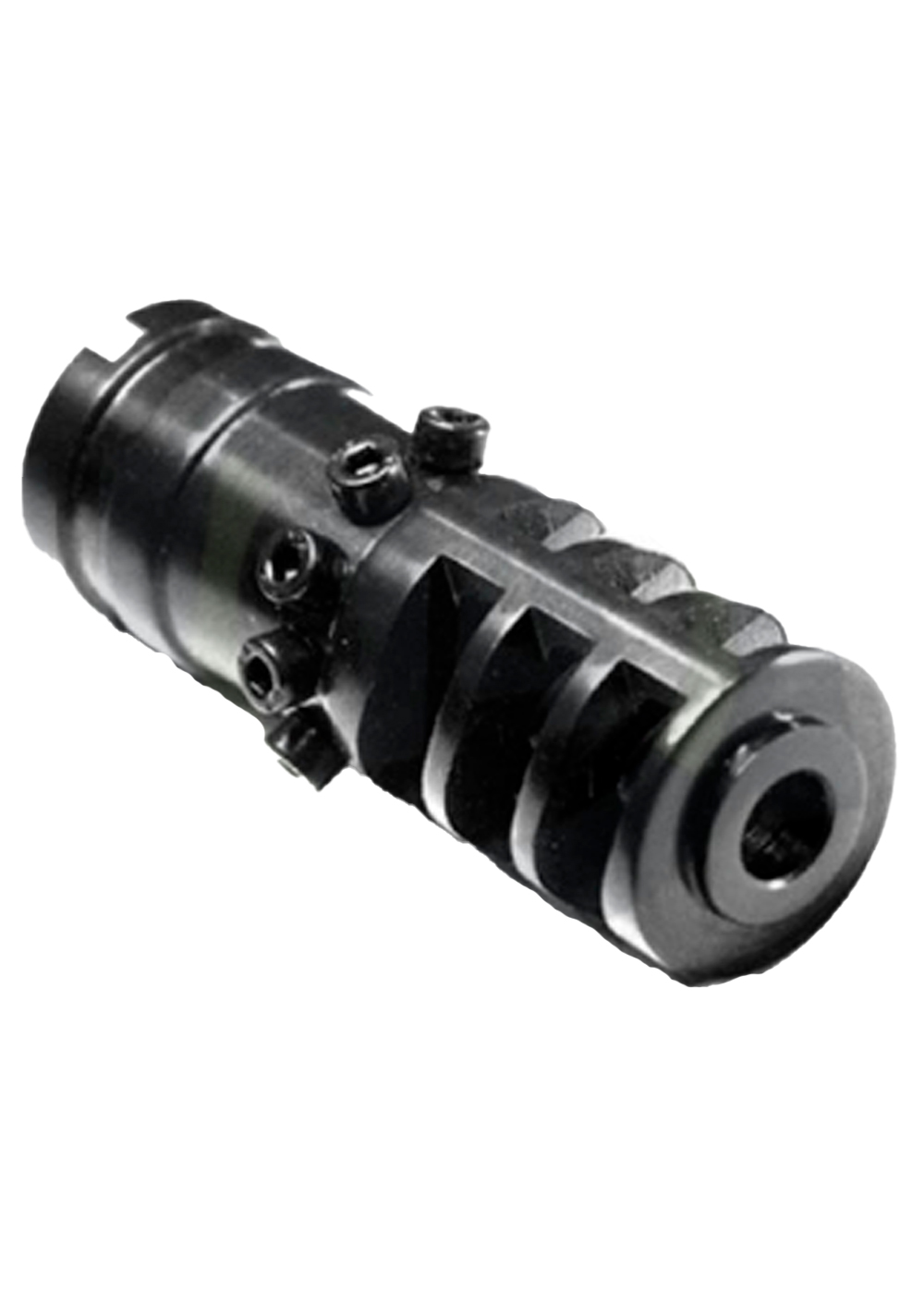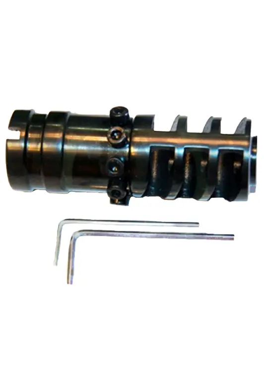 2) Внутренние рабочие камеры имеют конструктивную особенность регулируемого газосброса, возможность регулировки компенсации подскока оружия после выстрела под разными углами при помощи ПЯТИ отверстий для отвода пороховых газов с учетом индивидуальных особенностей, позволяющих оптимизировать оружие под стрелка и боеприпасы.