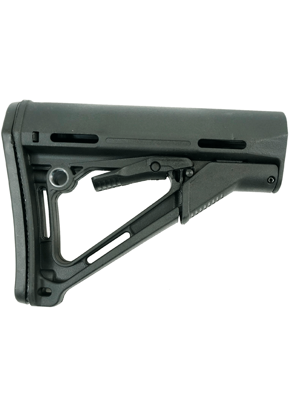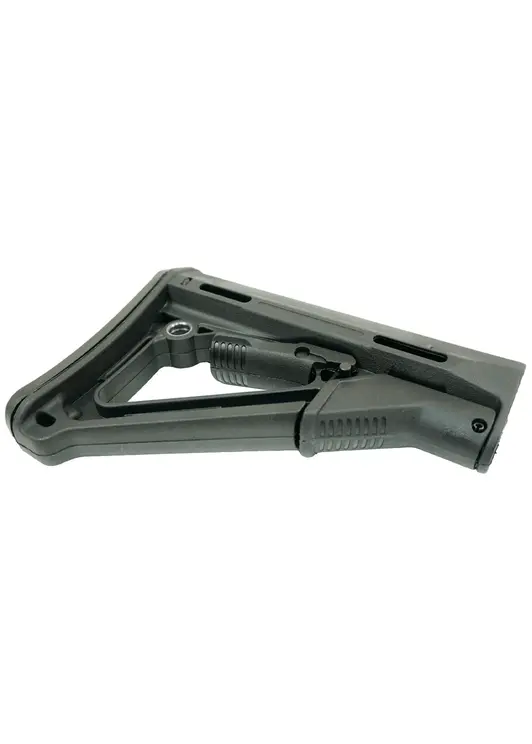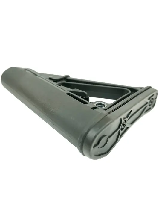 Как и прототип, приклад Magpul в версии от производителя Patriot выполнили из ударопрочной пластмассы. Тыльная часть резиновая, а крепежные элементы — металлические. Деталь весит 300 грамм.