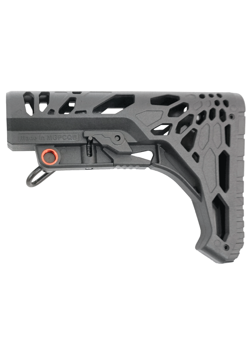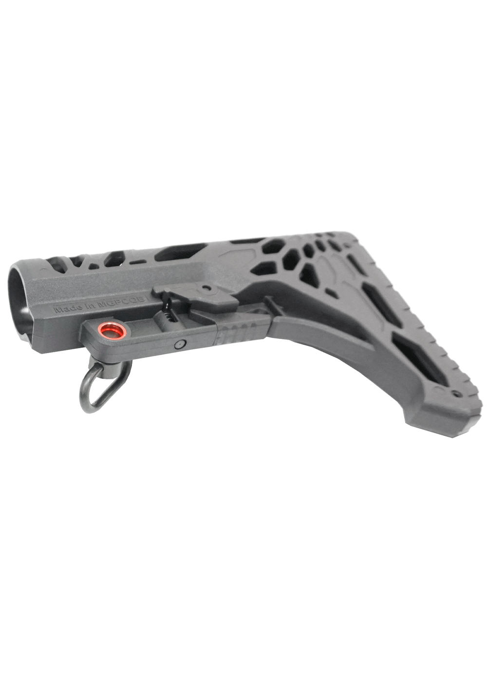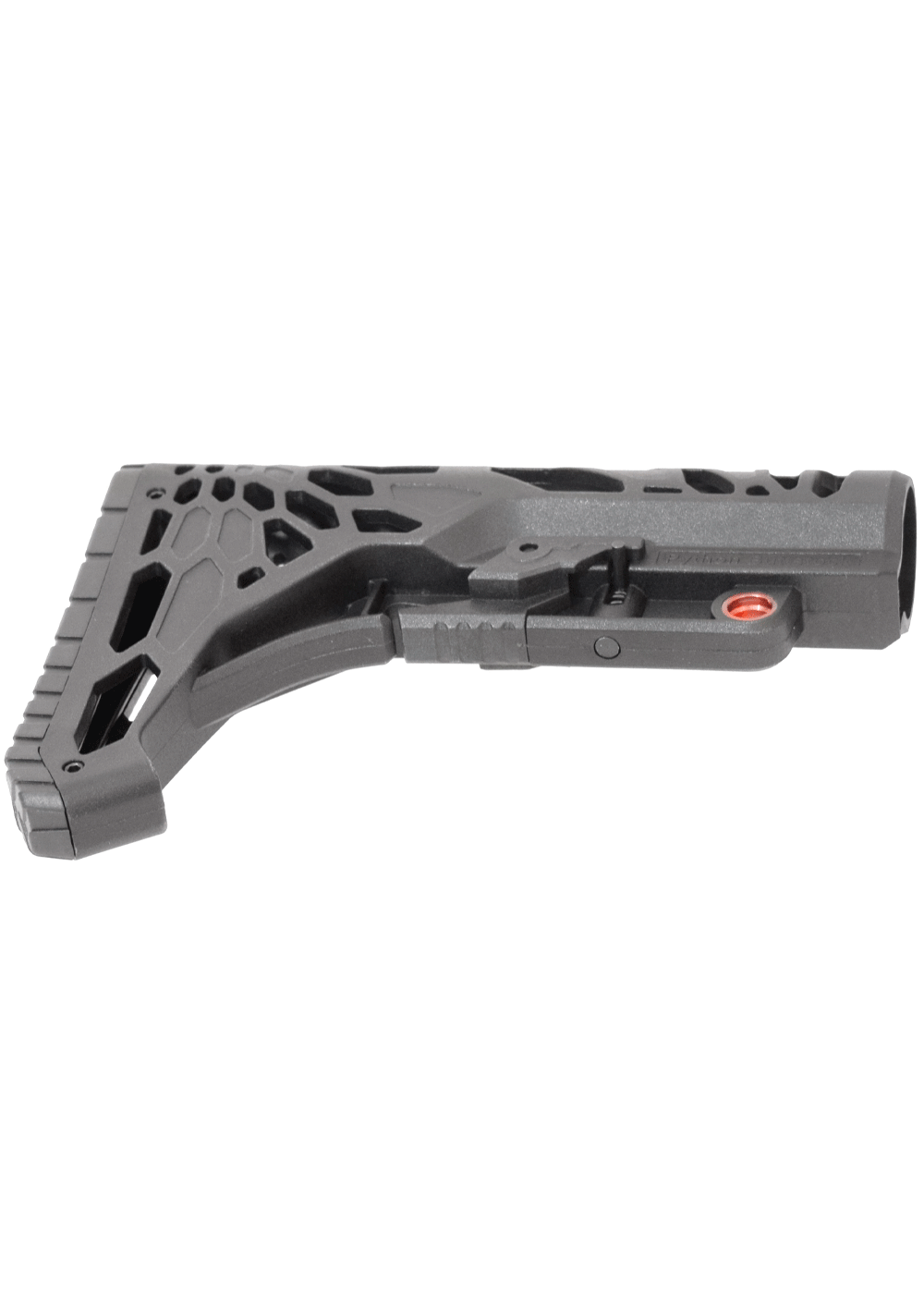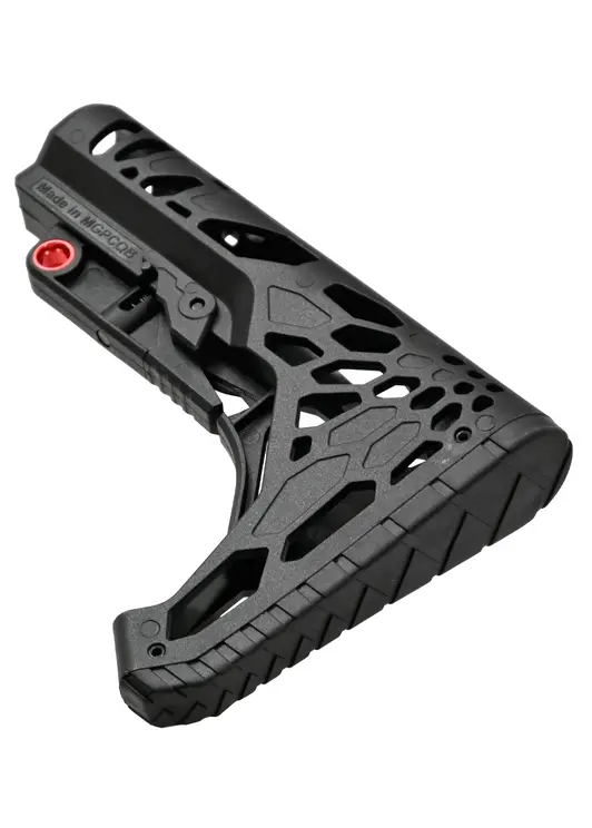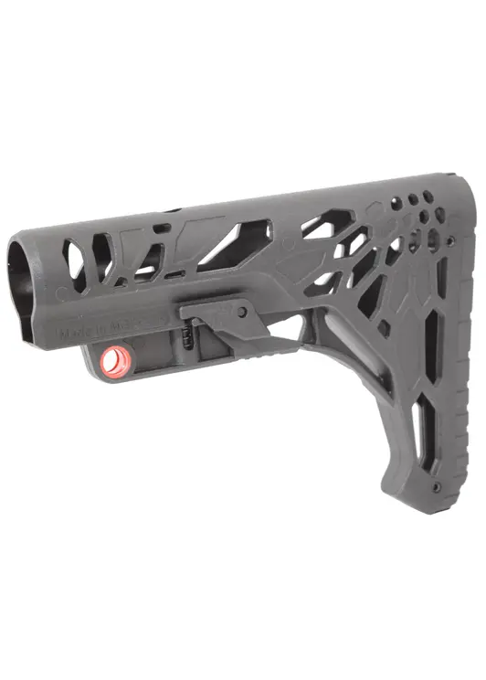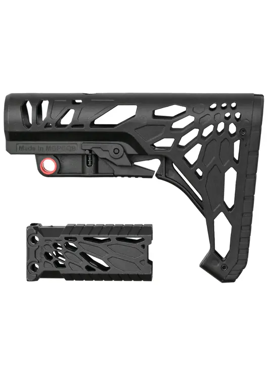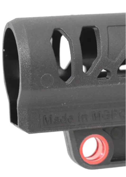 Перемещение приклада проводится путем расслабления фиксатора. Нажав на кнопку в средней части пользователь сможет перемещать накладку по трубе. В передней части присутствует металлическая вставка, куда крепится QD-антабка. При этом сзади выполнили штатную прорезь под плоский ремень.