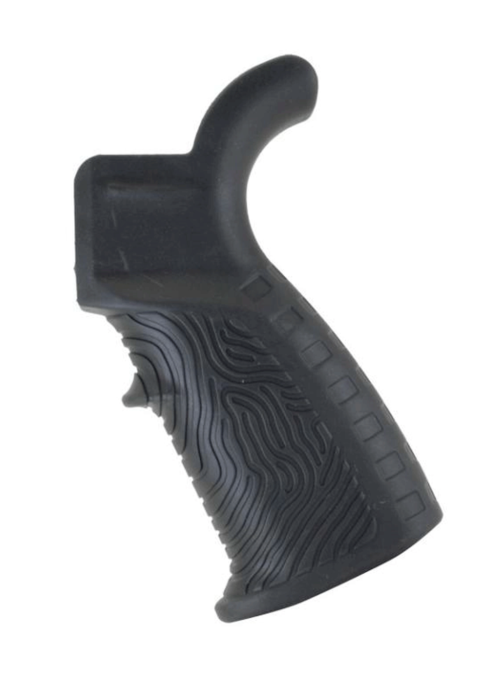 - Рукоятка AR-15 оборудована упором под средний палец для более комфортного удержания ружья, сужением в верхней части для машинального формирования правильного хвата, а также нижним рантом для предотвращения срыва руки во время прицеливания и стрельбы;