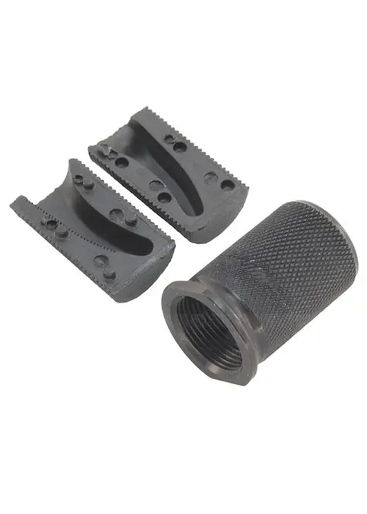 - Две полимерные накладки имеют резьбу с внешней стороны, на которую накручивается алюминиевый кожух. Такое строение позволяет не беспокоиться, что рукоятка слетит в самый неподходящий момент;