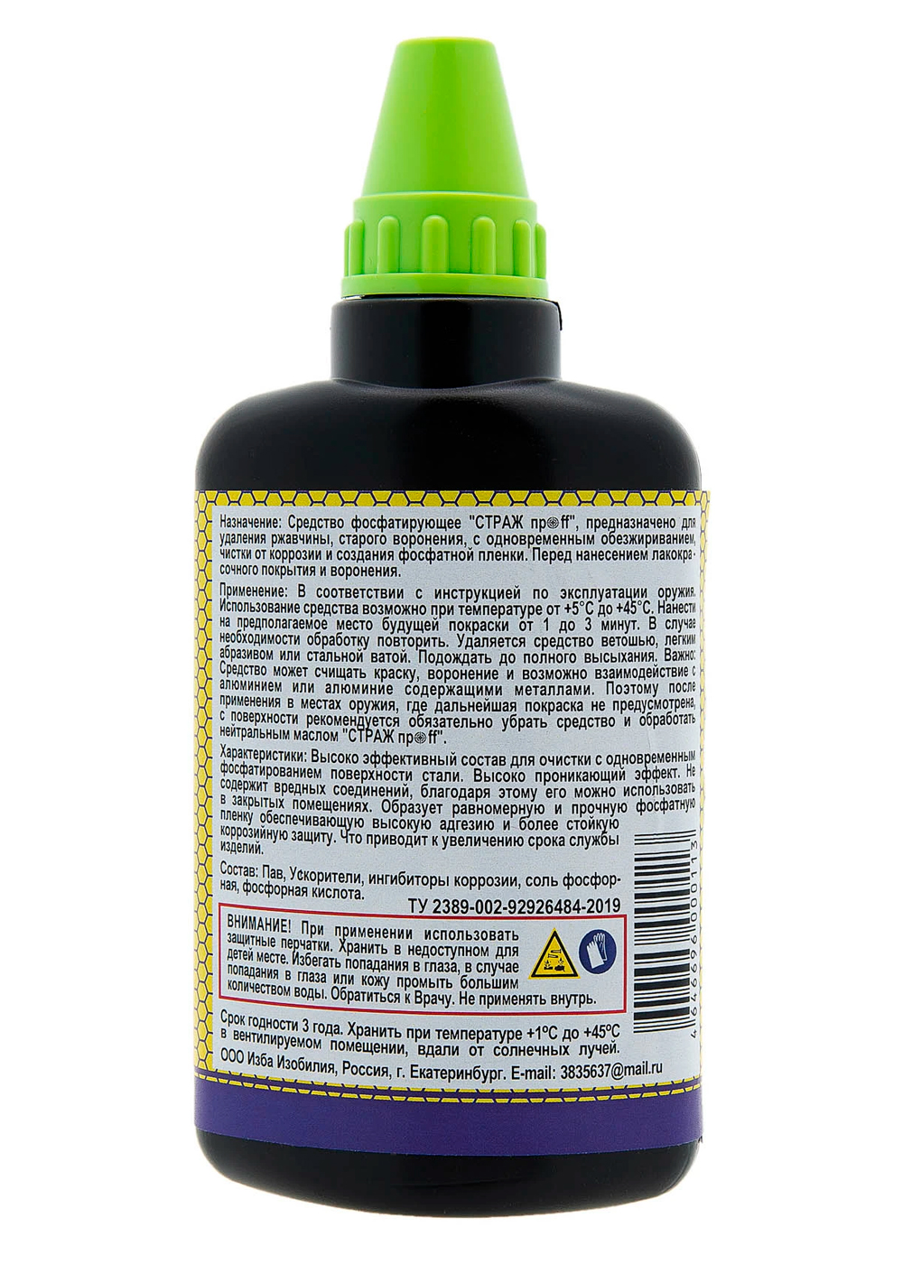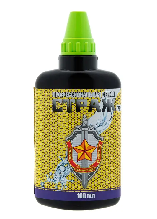 Специальный раствор отечественного производства Страж Профф. Представленный раствор предназначен для удаления ржавчины и очистки металла от старого воронения. Формула построена на основе фосфатирующего вещества. Позволяет легко удалить элементы коррозии и очистить металлическую поверхность. Объем - 100 миллилитров. Товар произведен в России.