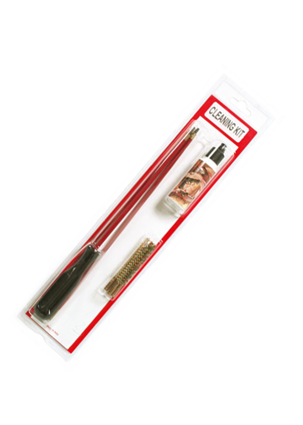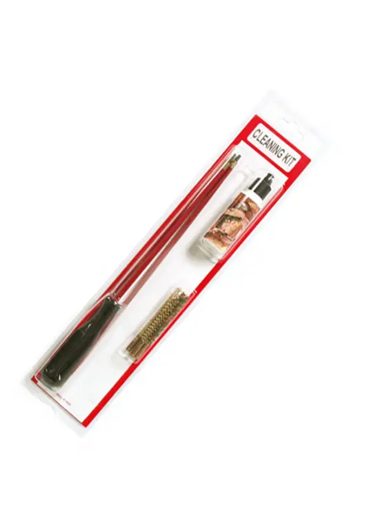 В набор входят: трехсекционный разборный шомпол (стальной в пластиковой оболочке), вишер-пуховка, щетинный вишер и щетинный металлический вишер, оружейное масло (25мл.).