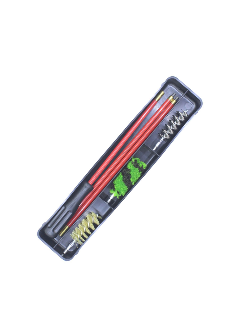 Набор для чистки гладкоствольного оружия 16 калибра, состоящий из металлического шомпола, трех ершей для чистки канала ствола и чехла для хранения и транспортировки.