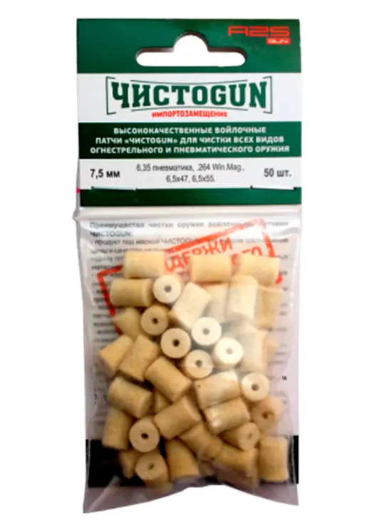 Войлочные патчи ЧистоGUN предназначены для чистки оружия калибра 6,35 пневматика, .264 WinMag, 6,5x47, 6,5x55. Диаметр патчей составляет 7,5 мм, в упаковке 50 штук. Патчи изготовлены из войлока и обладают высокой эффективностью при удалении нагара, копоти и других загрязнений с поверхности ствола оружия.