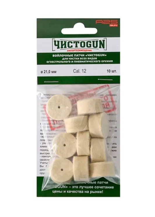 Войлочные патчи ЧистоGUN предназначены для чистки огнестрельного оружия 12 калибра. Диаметр патчей составляет 21 мм. В одной упаковке 10 патчей. Используются для удаления остатков пороха, нагара и других загрязнений из канала ствола.