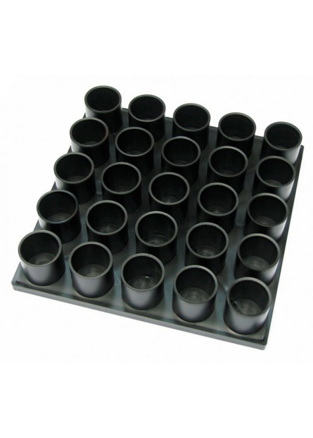 Подставка создана для вертикальной фиксации боеприпасов во время их снаряжения. Обеспечивает хорошую устойчивость боеприпаса, установленного в ячейку. Подставка состоит 25 ячеек. Подходит для гильз 12 калибра. При релоадинге большого числа патронов, может возникнуть ситуация, когда снаряженные, но не закрученные боеприпасы, падают на бок. В результате этого высыпается дробь, картечь, порох и вследствие этого патроны приходится снаряжать заново. Это приводит к потере времени. Изделие изготовлено из ABS пластика, не «горбится» и не гнется, обеспечивает устойчивость патронов, даже если по ножке стола, на котором происходит заряжание, несильно ударить ногой (распространённая ситуация при релоадинге). Гильзы в ячейках подставки стоят строго вертикально, что предоставляет возможность переносить не до конца снаряжаемые патроны от одного рабочего места к другому. Кроме того, нет необходимости, при закрутке разнообразными снарядами расставлять их в разные углы стола, чтобы не перепутать. Крайне удобная и недорогая вещь.