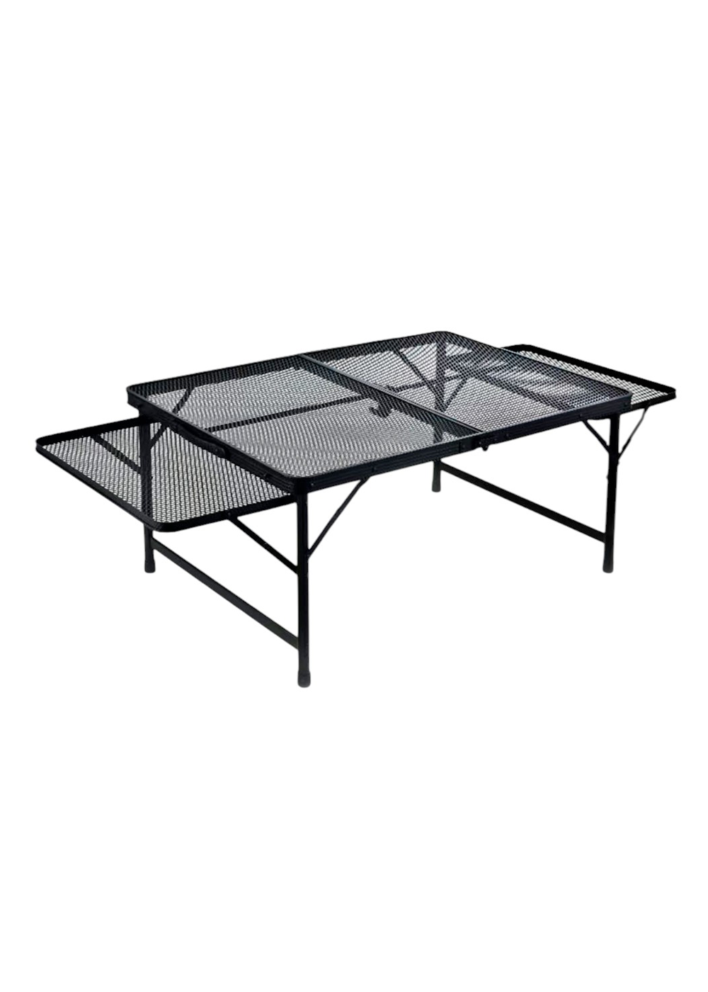 Складной стол Hispeed с двумя дополнительными столиками имеет размеры 150x57x42 см и выполнен в черном цвете. Дополнительные столики можно использовать как подставки для еды или напитков. Этот стол идеально подойдет для пикника на природе или семейного обеда.