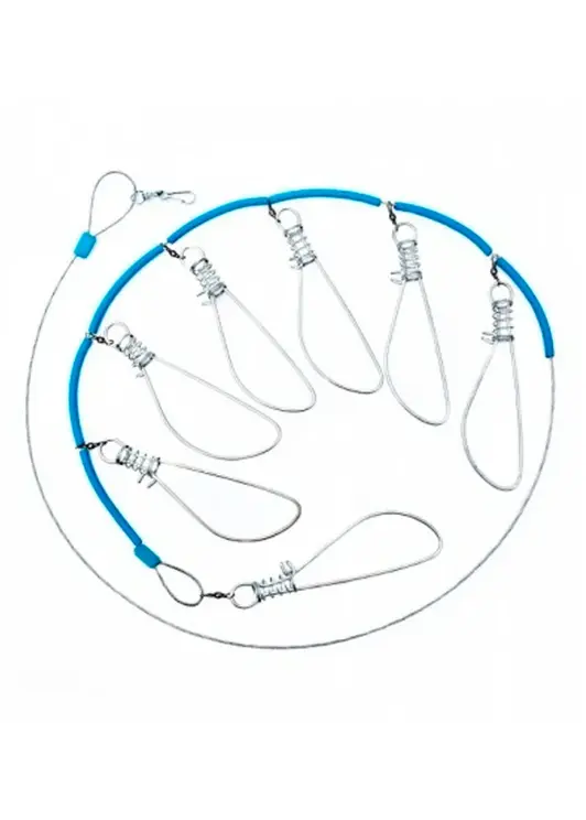 Кукан металлический — это простое и эффективное средство для хранения рыбы в естественной среде во время рыбалки. Он изготовлен из прочного троса с петлёй на конце, в которую продет карабин. Крепление петли заизолировано, а трос имеет анти-коррозионное покрытие, что обеспечивает долговечность использования.