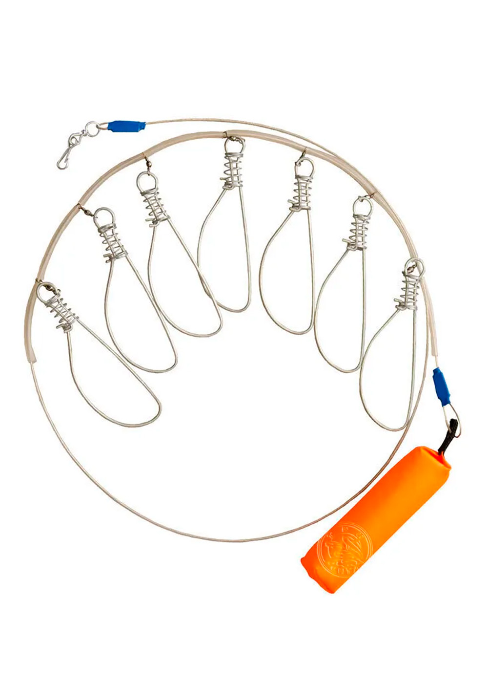 Кукан металлический — это простое и эффективное средство для хранения рыбы в естественной среде во время рыбалки. Он изготовлен из прочного троса с петлёй на конце, в которую продет карабин. Крепление петли заизолировано, а трос имеет анти-коррозионное покрытие, что обеспечивает долговечность использования.
