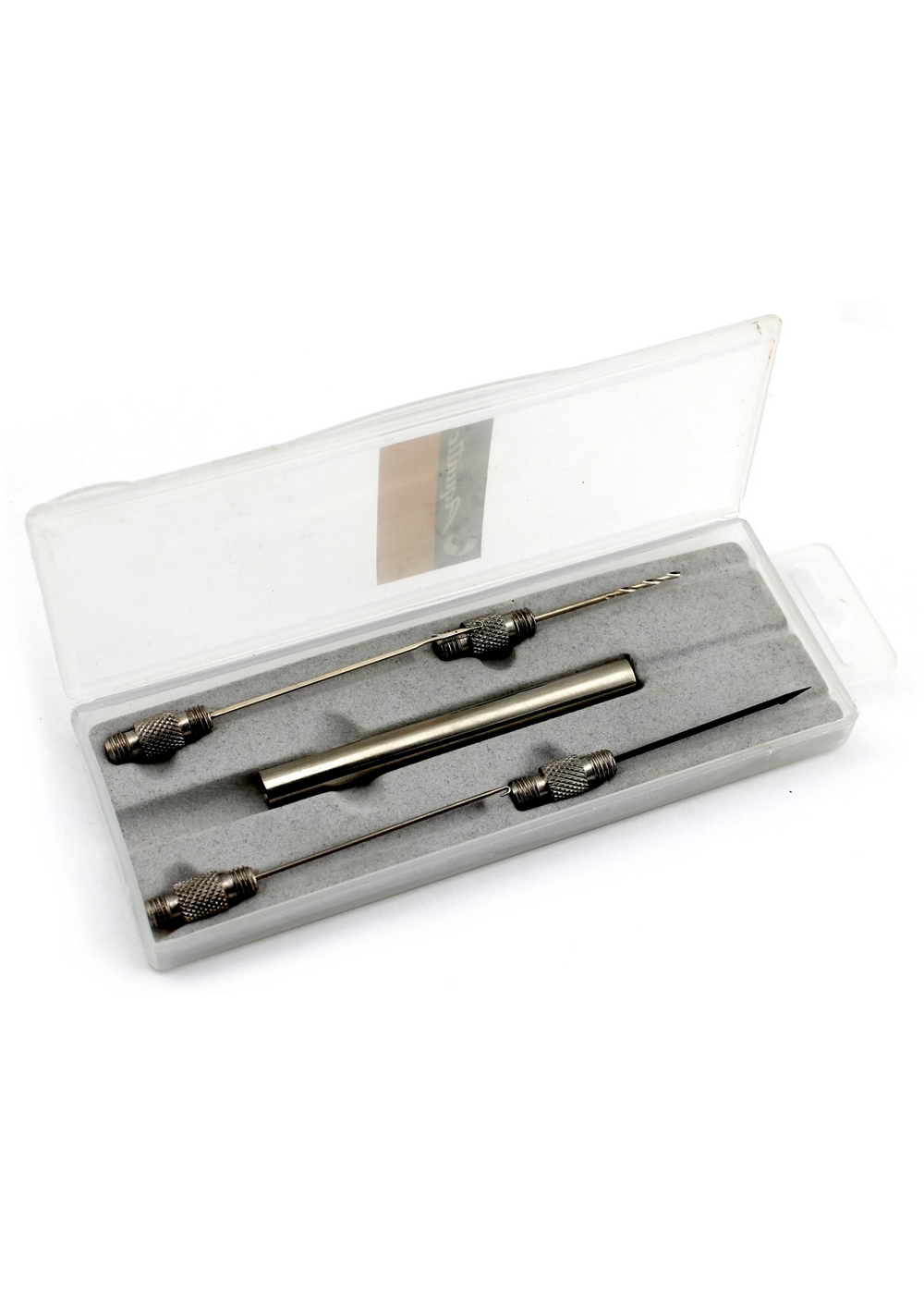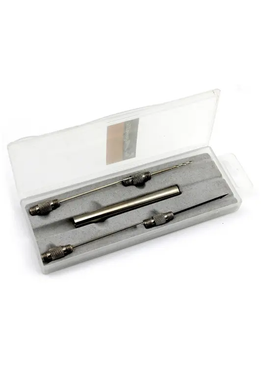 Набор монтажного инструмента CP548-BX для изготовления карповых монтажей включает четыре инструмента. Для того, чтобы сделать аккуратное отверстие в мягком бойле или мелкой насадке, пригодится игла. Она тонкая, острая и, благодаря замковому механизму, позволяет сразу подцепить волос. При работе с твердыми бойлами или крупными насадками пригодится сверло. А нанизать впоследствии \”угощение\” для рыбы на волос можно при помощи протяжки.