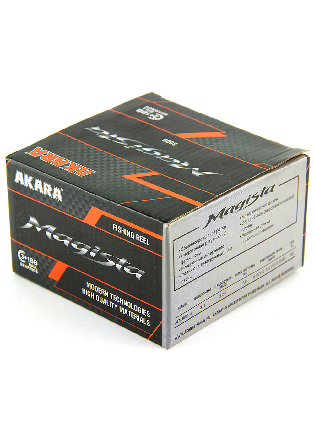 Катушка безынерционная Akara Magista AFM 3000 3+1bb - линейка универсальных катушек для спиннинговой ловли от компании Akara. Катушка имеет облегченное карбоно-композитное тело. Увеличенный срок службы механизма катушки. Облегченная алюминиевая шпуля. Система сверхточной балансировки ротора. Облегченная алюминиевая ручка. Антикоррозионное покрытие всех деталей катушки. Усиленная полая дуга. Бронзовый червячный вал. Прецизионный ролик для ловли на шнуры диаметром до 0,06 мм. Основная металлическая полуматчевая шпуля. При обзоре характеристик и тестов, катушка Akara Magista AFM 3000 получила положительные отзывы и рейтинги экспертов по рыбной ловли. Катушка Akara Magista AFM выпускается в двух типоразмерах: 2000 и 3000. Максимальная нагрузка на фрикцион 7 кг.