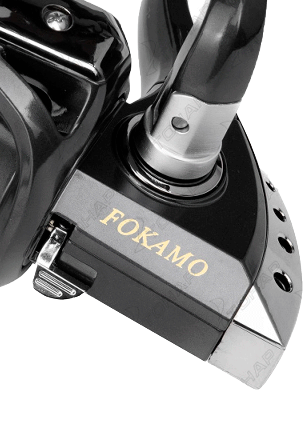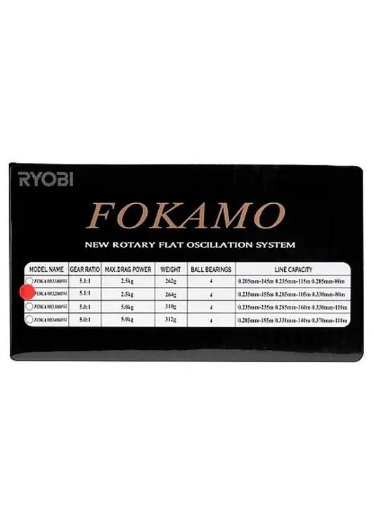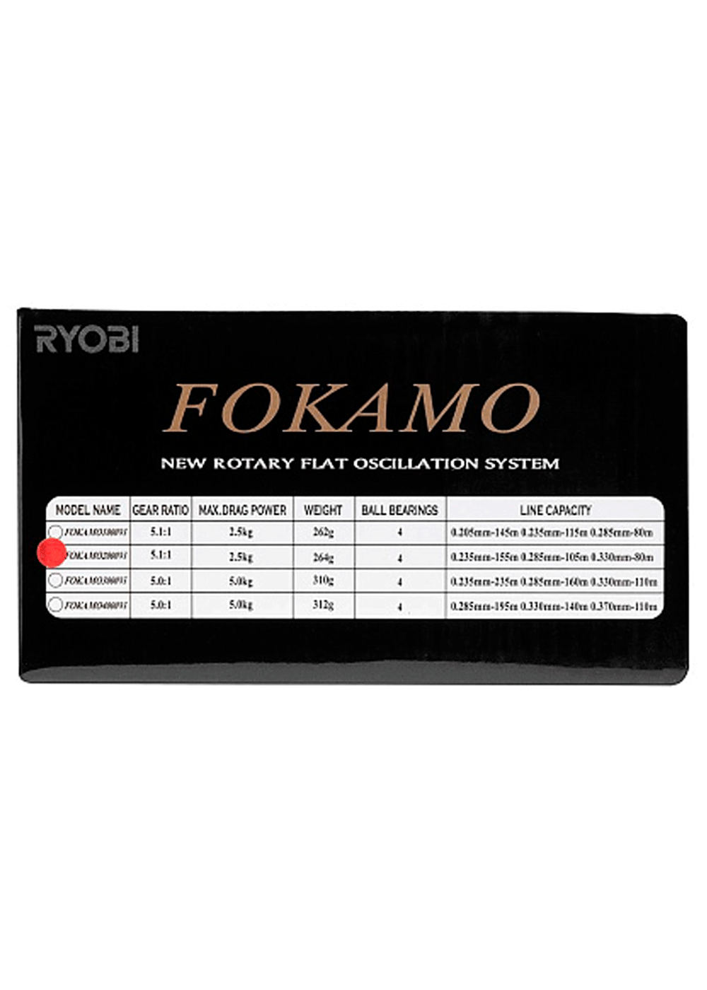 Ryobi Fokamo - это линейка безынерционных катушек, состоящая из четырех моделей. За счет применения легкого полимера при изготовлении основных частей корпуса и V-образного ротора, вес каждого экземпляра не слишком большой и находится в пределах от 265 до 315 гр. Передаточное число тоже может разниться и составляет либо 5.1:1, либо 5.0:1. Чтобы механизм работал более плавно, в катушках устанавливаются пять подшипников (четыре шариковых и один роликовый). А с целью снижения излишней вибрации, ротор проходит специальную балансировку. Есть система анти-реверса (для предотвращения незапланированного прокручивания назад), но также имеется и переключатель реверса (если вдруг появилась необходимость крутить ротор в обратном направлении). Если вы хотите сложить ручку на время хранения катушки - воспользуйтесь отдельной кнопкой. Ну а для перестановки этого элемента под другую руку - отверните декоративную заглушку, находящуюся с другой стороны корпуса, и открутите фиксирующий винт. После этого поменяйте их местами. Ryobi Fokamo комплектуется металлической шпулей, способной вместить от 0.205мм/145м до 0.33мм/140м монофильной лески. Фрикцион передний, с максимальной нагрузкой 2,5 или 5 кг.