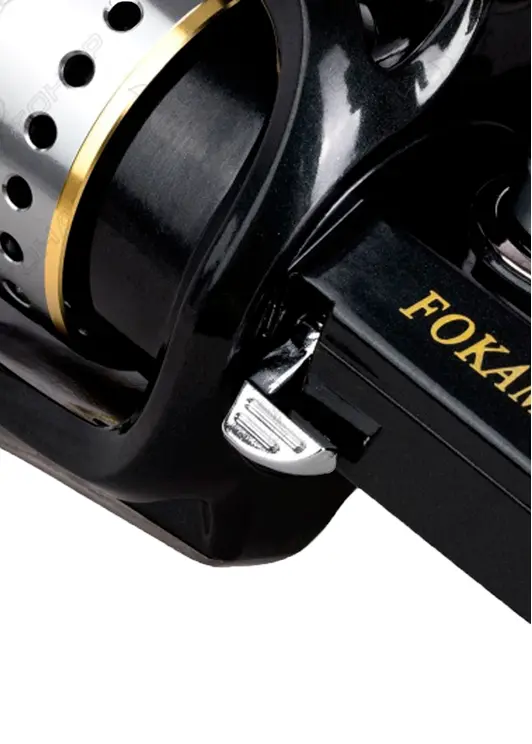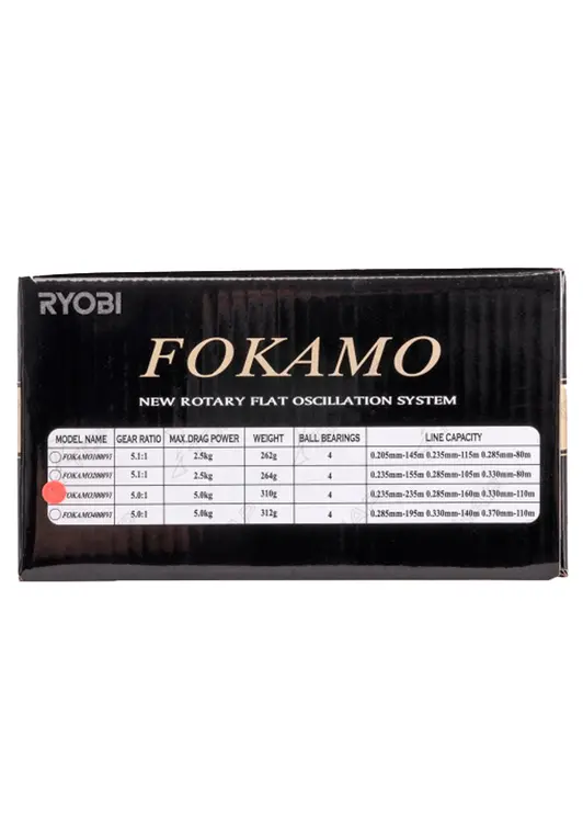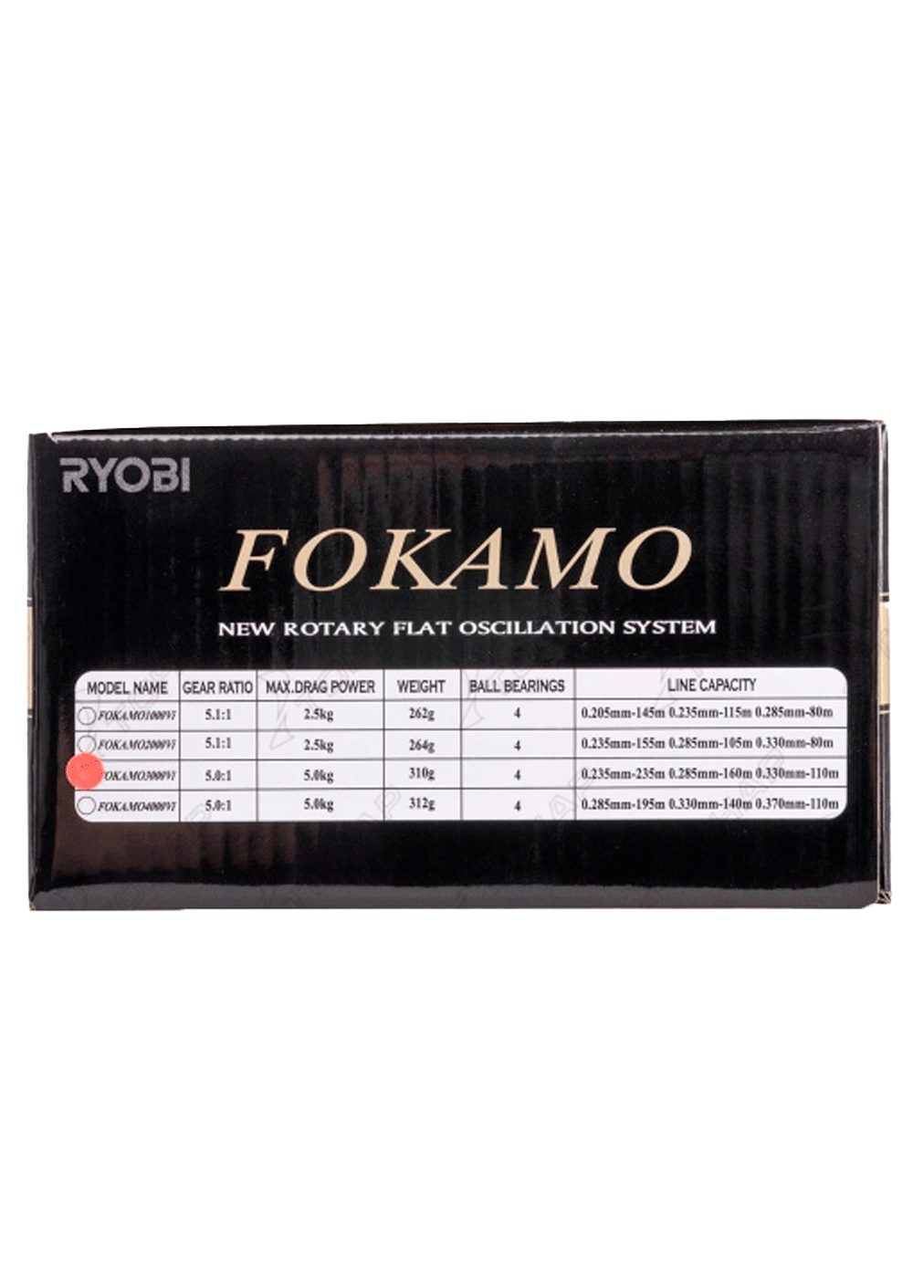 Ryobi Fokamo - это линейка безынерционных катушек, состоящая из четырех моделей. За счет применения легкого полимера при изготовлении основных частей корпуса и V-образного ротора, вес каждого экземпляра не слишком большой и находится в пределах от 265 до 315 гр. Передаточное число тоже может разниться и составляет либо 5.1:1, либо 5.0:1. Чтобы механизм работал более плавно, в катушках устанавливаются пять подшипников (четыре шариковых и один роликовый). А с целью снижения излишней вибрации, ротор проходит специальную балансировку. Есть система анти-реверса (для предотвращения незапланированного прокручивания назад), но также имеется и переключатель реверса (если вдруг появилась необходимость крутить ротор в обратном направлении). Если вы хотите сложить ручку на время хранения катушки - воспользуйтесь отдельной кнопкой. Ну а для перестановки этого элемента под другую руку - отверните декоративную заглушку, находящуюся с другой стороны корпуса, и открутите фиксирующий винт. После этого поменяйте их местами. Ryobi Fokamo комплектуется металлической шпулей, способной вместить от 0.205мм/145м до 0.33мм/140м монофильной лески. Фрикцион передний, с максимальной нагрузкой 2,5 или 5 кг.