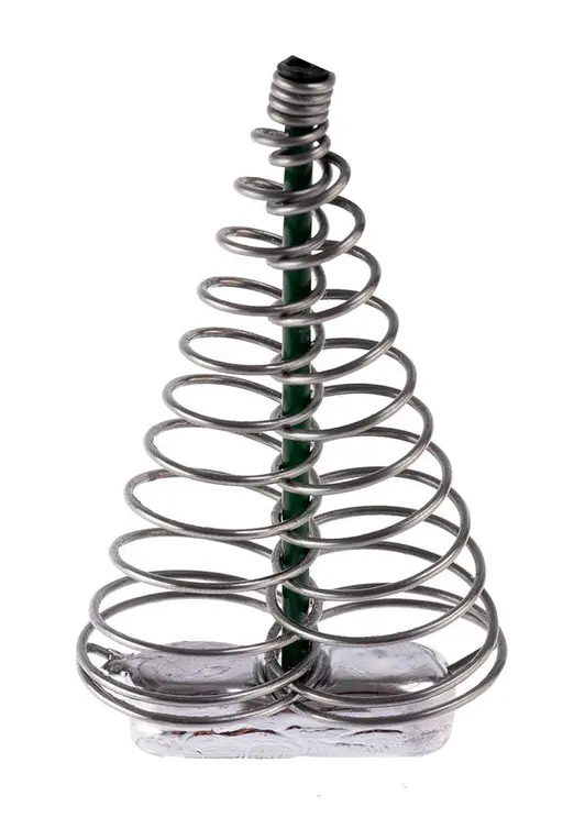 Фидерная кормушка плоская огруженная "Дубль". Кормушка представляет собой две соединенные конусные пружины на конце которых располагается плоское грузило. Кормушка подходит для использования ее для ловли на реке, где присутствует течение, так же может использоваться и при ловле на водоемах со стоячей водой.