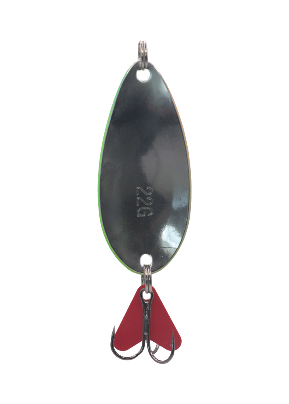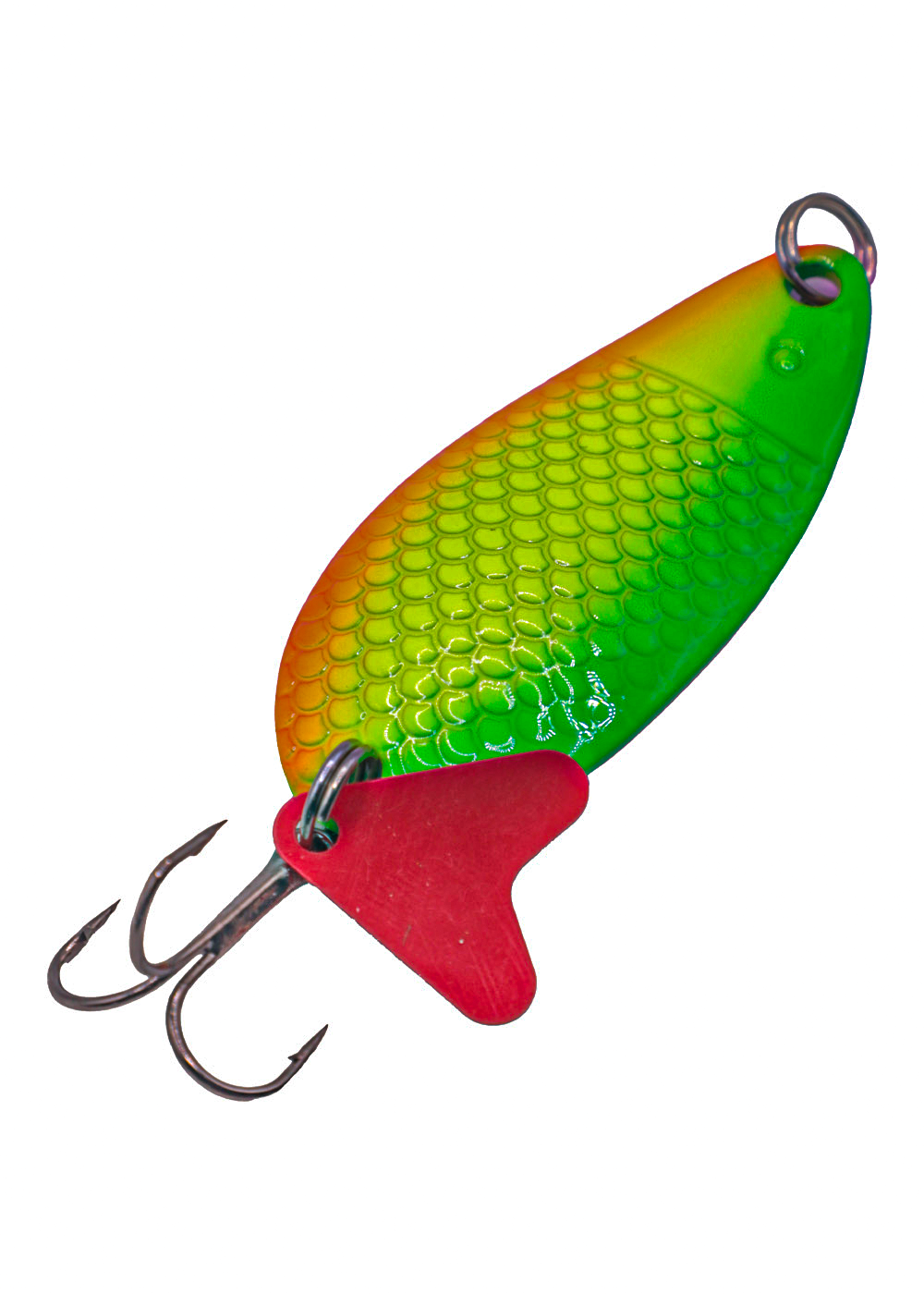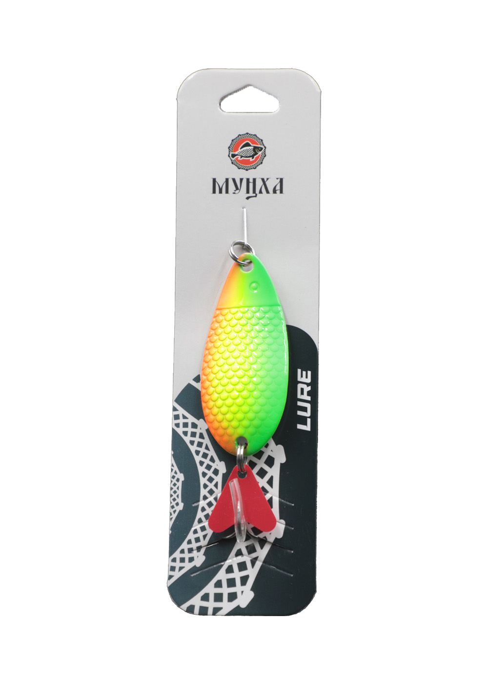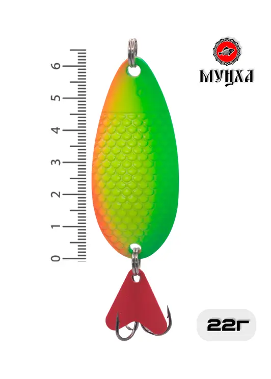 Мунха 22g, E199-22 — колеблющаяся блесна весом 22 грамма, предназначенная для ловли хищной рыбы на глубине и при сильном течении. Верхняя сторона окрашена в яркий неоновый градиент от оранжевого к зелёному с выраженной чешуйчатой текстурой, имитирующей естественный бок рыбы и усиливающей светоотражение. Такой окрас делает приманку особенно заметной в мутной воде или при слабом освещении.