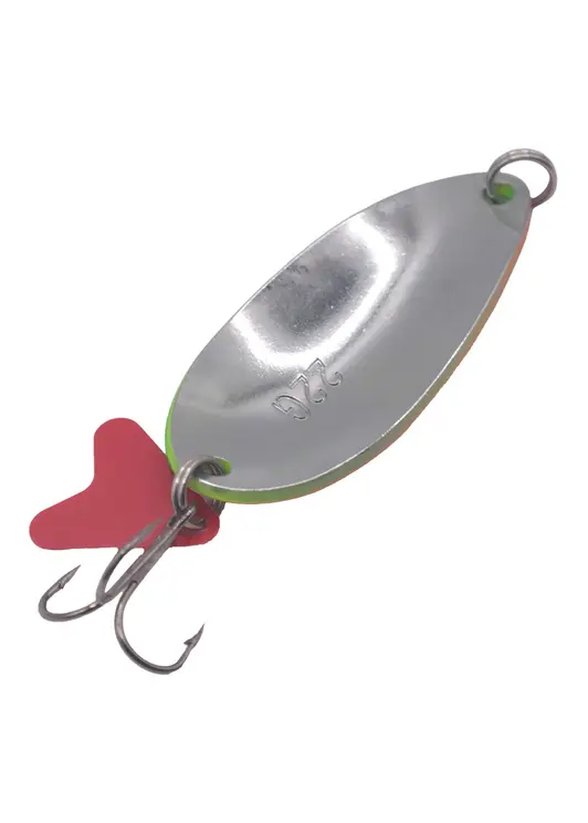 Обратная сторона выполнена из гладкого хромированного металла с зеркальной полировкой, что создаёт мощные световые блики при проводке. На теле выгравирован вес — "22g". Оснащена острым тройным крючком с ярко-красным пластиковым хвостовым стабилизатором, который добавляет привлекательности и усиливает игру блесны.