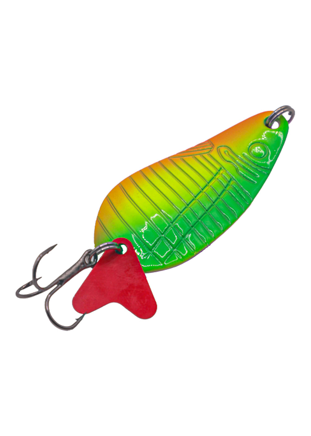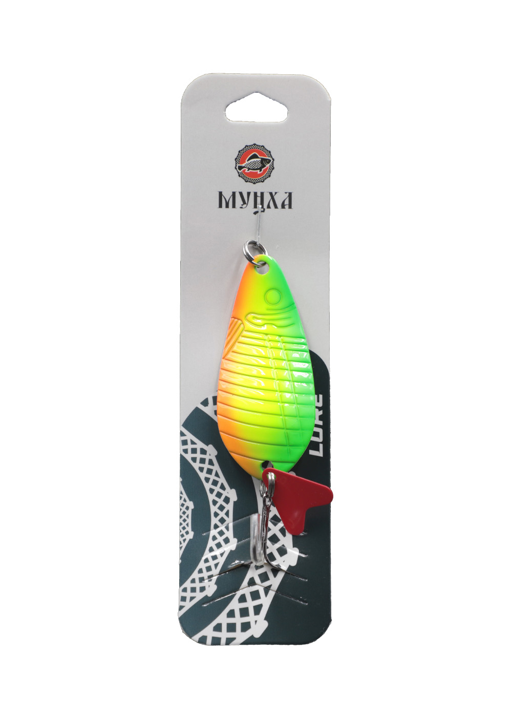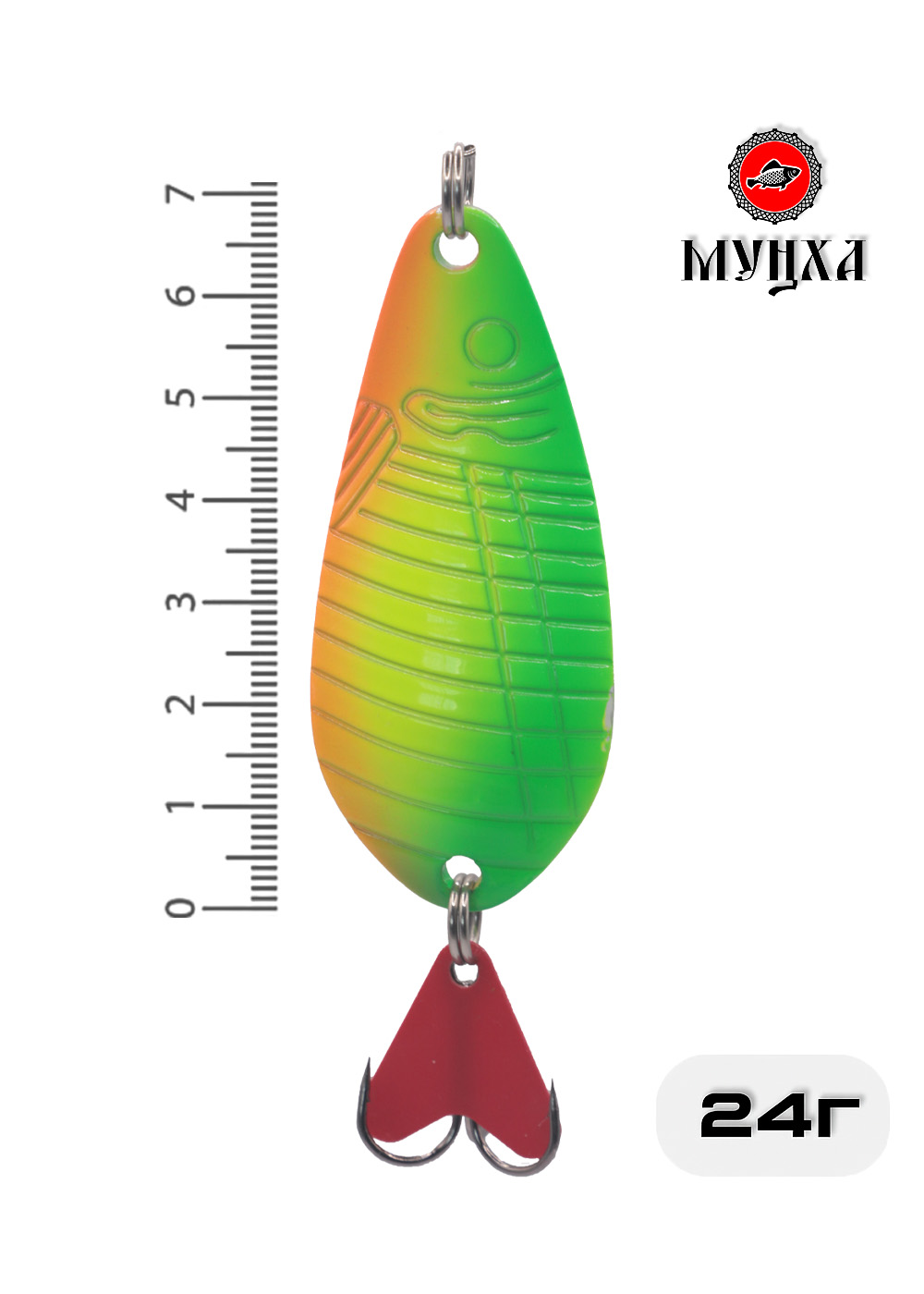 Мунха 24g, E199-24 — колеблющаяся блесна с ярким неоновым окрасом и выразительным рельефом, имитирующим очертания рыбы. Градиентная расцветка в зелёно-жёлто-оранжевых тонах повышает заметность приманки в любых условиях — от пасмурной погоды до мутной воды.