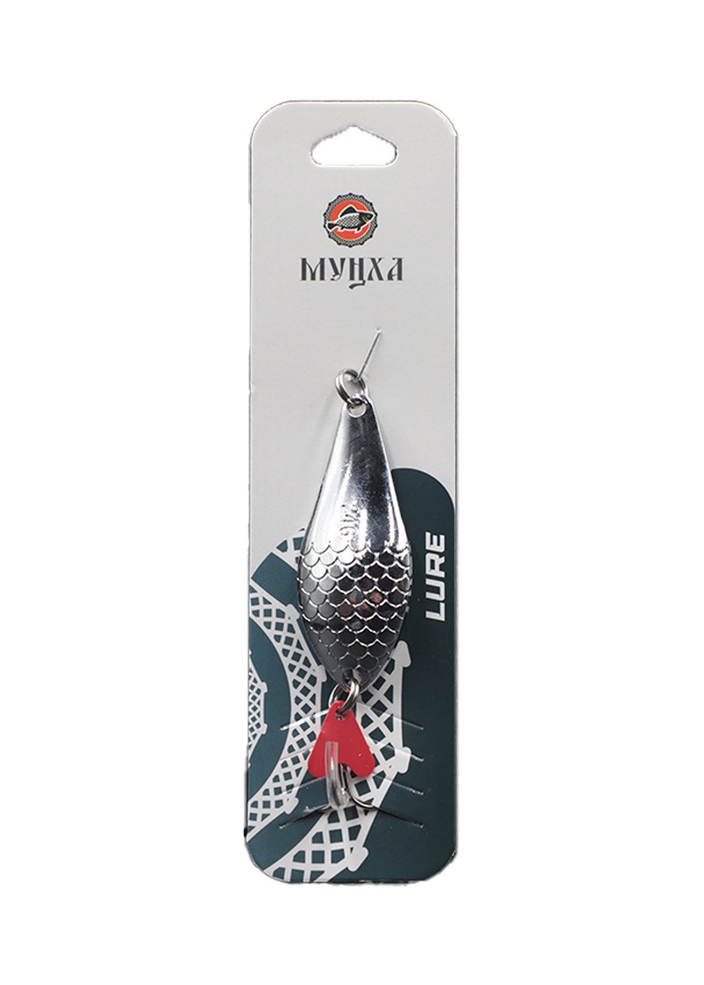 Мунха 24g, E199-25 — колеблющаяся блесна в классическом серебристом исполнении с объёмной чешуйчатой текстурой, максимально приближённой к естественному облику рыбьей чешуи. Благодаря зеркальной поверхности и рельефу блесна отлично отражает свет, создавая эффект "живого" блика, который привлекает хищника даже с большого расстояния.