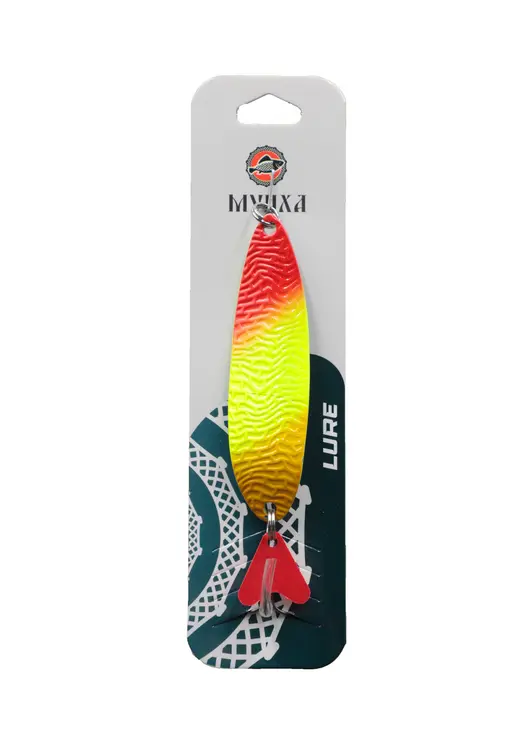 Мунха 27g, E199-11 — вытянутая колеблющаяся блесна с агрессивным, броским дизайном для охоты на активного хищника. Лицевая сторона окрашена в яркий градиент от красного к кислотно-жёлтому, а поверхность покрыта текстурой с волнообразным рельефом, усиливающим игру света при проводке.