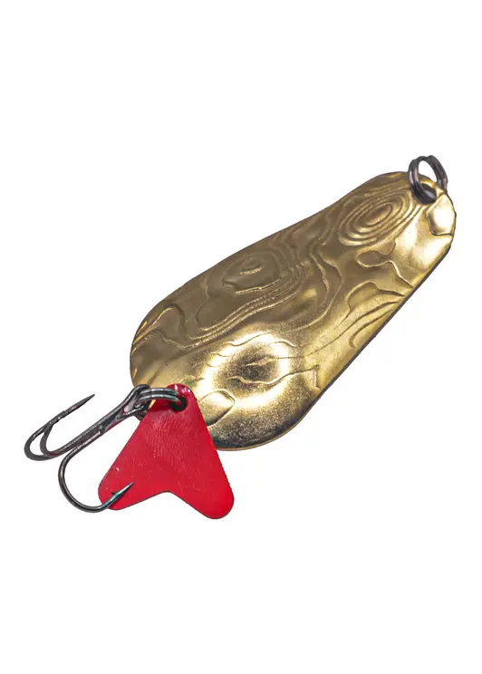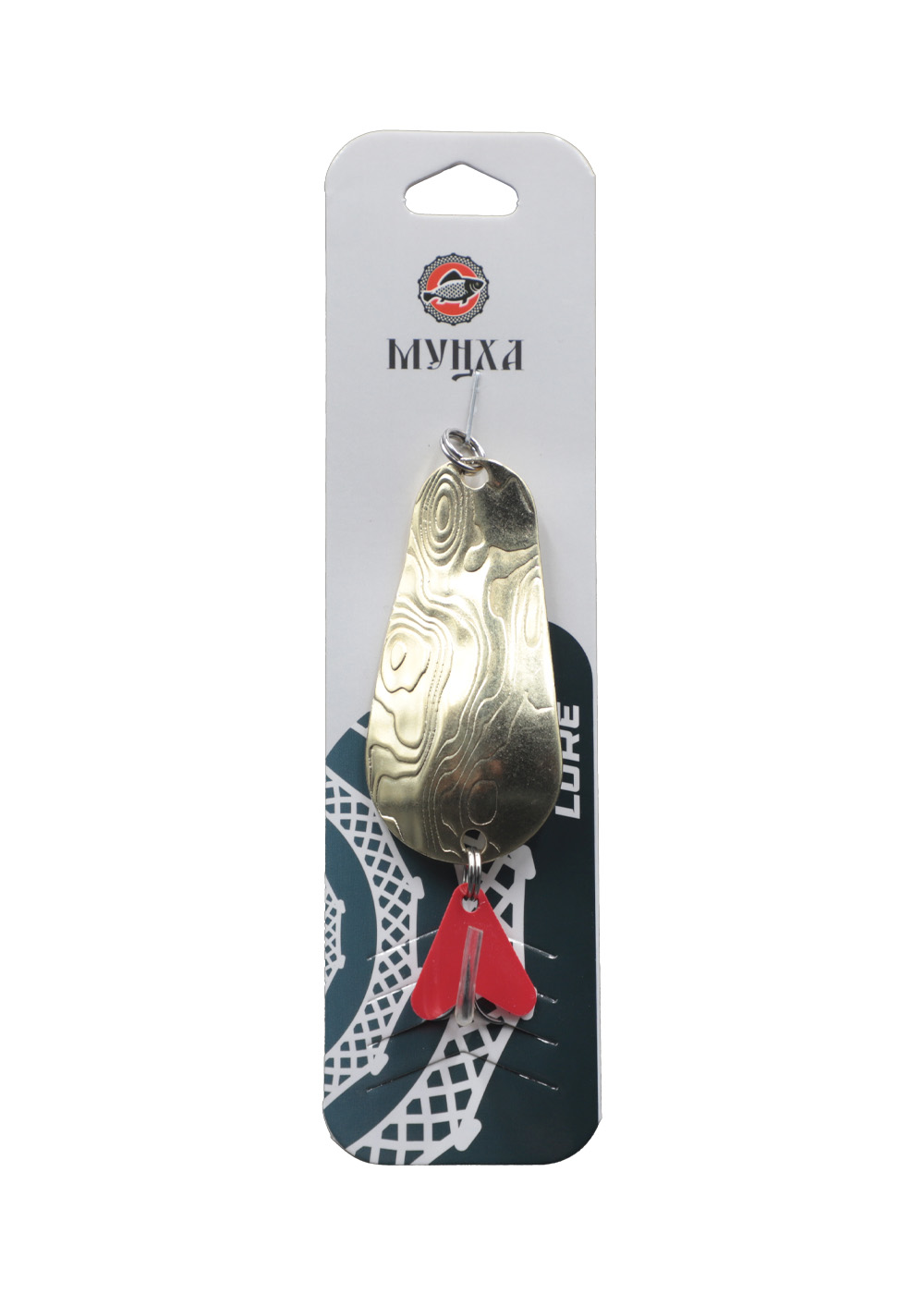 Мунха 32g, E199-16 — тяжёлая колеблющаяся блесна с выразительным «дамасским» узором и золотистым покрытием, идеально подходящая для трофейной ловли на глубине. Эффектный рисунок на внешней стороне корпуса имитирует слои металла, создавая игру бликов и дополняя визуальную привлекательность приманки.