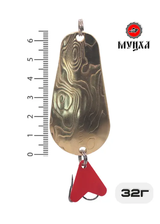 Вес 32 грамма обеспечивает отличную дальнобойность и стабильную работу даже в условиях сильного течения. Задняя сторона — гладкая, полированная, с тёплым металлическим блеском, привлекающим внимание хищника при каждом колебании.