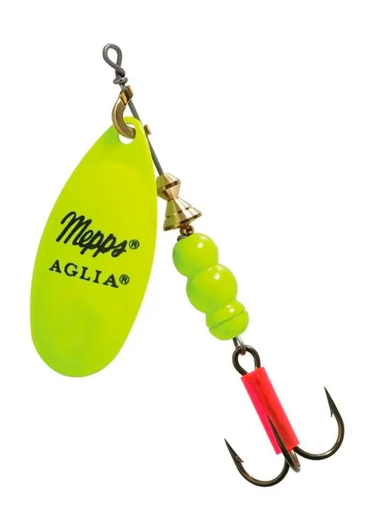 Aglia Fluo оснащена лепестками с очень яркой матовой окраской, дающей преимущество при ловле в темное время суток, на большой глубине и в мутной воде. Кроме того, Mepps в информационном материале часто публикует фотографии погруженной в воду панели, на которой размещены клейма, окрашенные в цвета этой разновидности Aglia. Все они изменяются более или менее значительно, а некоторые вообще становятся неузнаваемы. Например, розовый (pink) приобретает ярко-голубой оттенок, кроме того окраска вращающегося лепестка в воде кажется несколько мягче, чем в воздушной среде, при солнечном освещении.