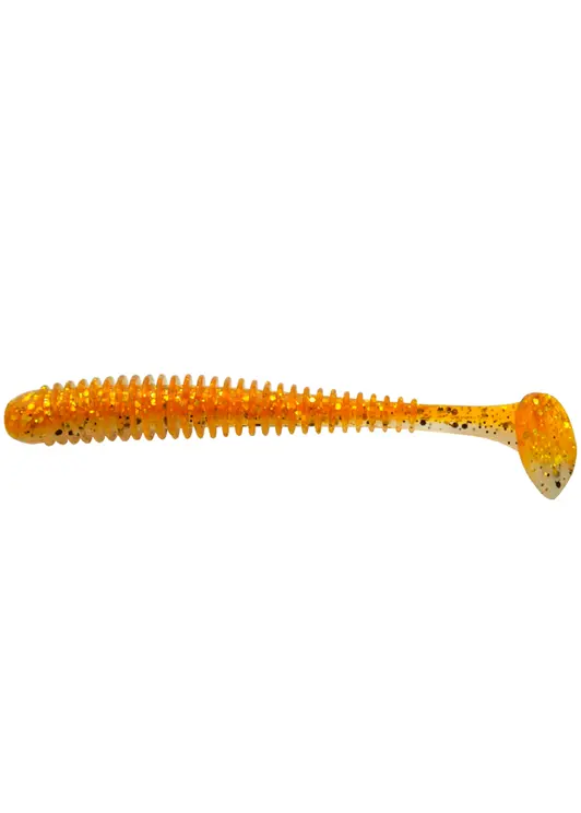 Материал приманки мягкий, но прочный, ароматизация умеренная, солевая пропитка минимальная. Амплитуда работы хвоста высокая, частота колебаний высокая. Дополнительные элементы – насечка из глубоких шумовых рёбер.