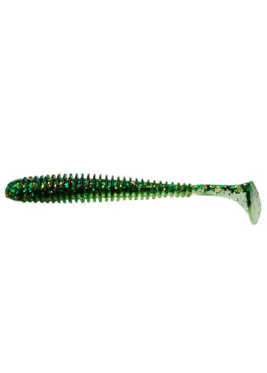 Материал приманки мягкий, но прочный, ароматизация умеренная, солевая пропитка минимальная. Амплитуда работы хвоста высокая, частота колебаний высокая. Дополнительные элементы – насечка из глубоких шумовых рёбер.