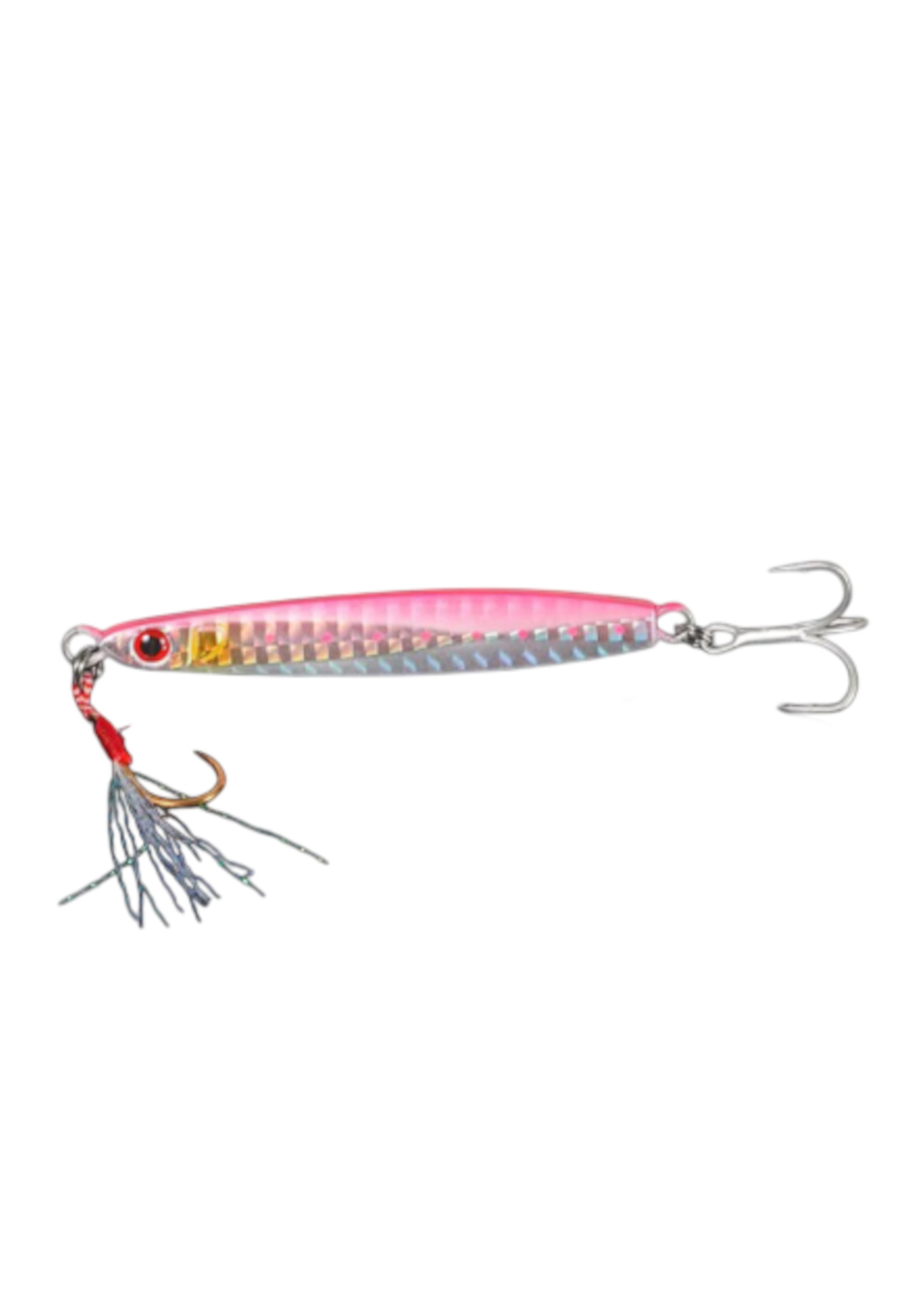 Аэродинамическое и вытянутое тело приманки обеспечивает дальний заброс и активную игру при падении. Установлены два типа крючков: прочный ассист с люрексом и острый тройник на хвосте, что увеличивает шанс засечки рыбы при атаке с разных сторон.