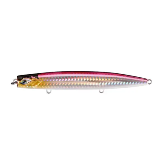 Цветовая схема NS205 — это выразительное сочетание чёрной спинки, золотистой головы и голографического корпуса с малиново-розовым отливом. Такая расцветка делает воблер заметным в любых условиях освещённости и привлекает внимание даже пассивного хищника.